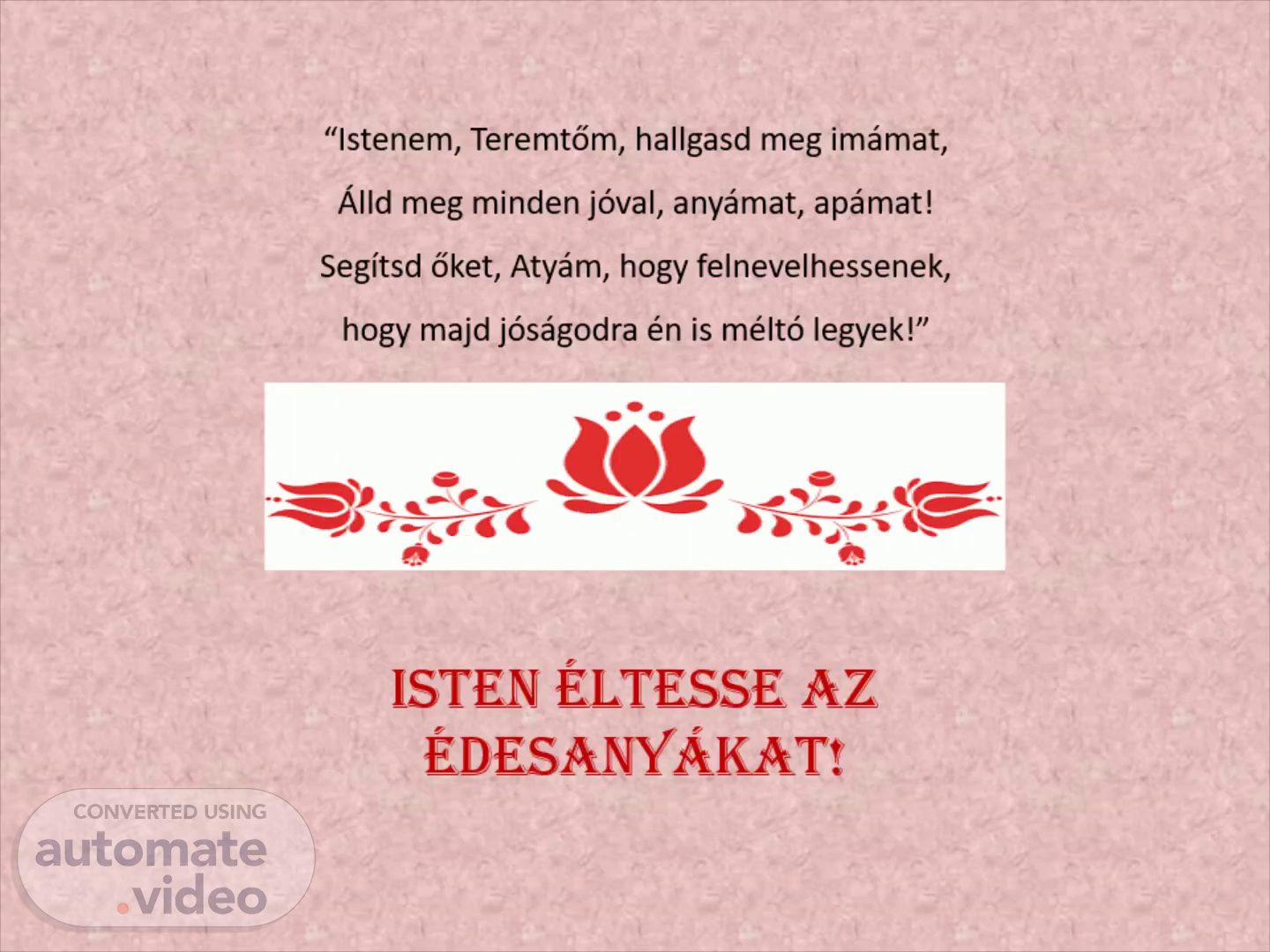 “ Istenem , Teremtőm , hallgasd meg imámat , Álld meg minden jóval , anyámat , apámat ! Segítsd őket , Atyám , hogy felnevelhessenek , hogy majd jóságodra én is méltó legyek !”.
