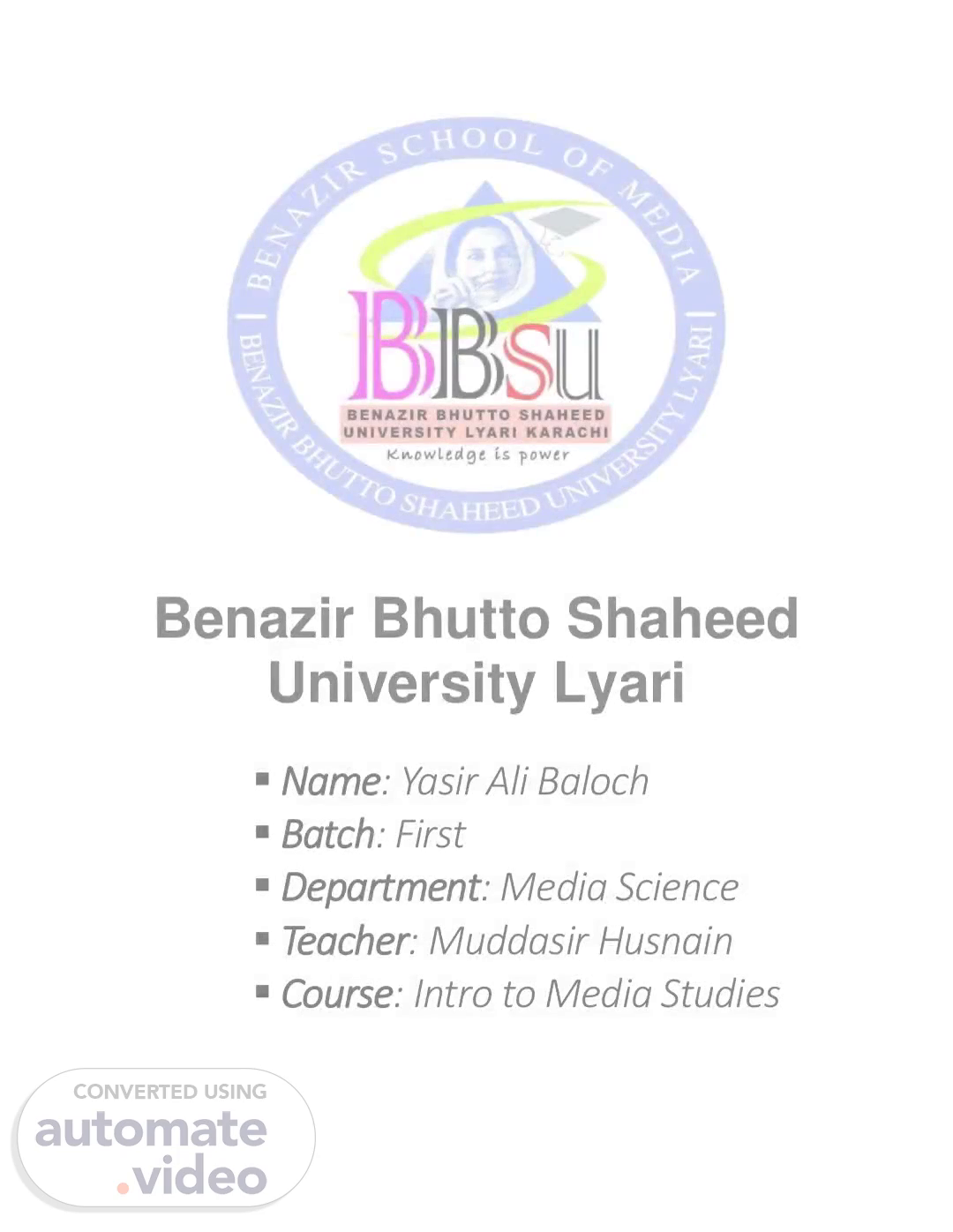 [Audio] Benazir Bhutto Shaheed University Lyari Name: Yasir Ali Baloch Batch: First Department: Media Science Teacher: Muddasir Husnain Course: Intro to Media Studies.