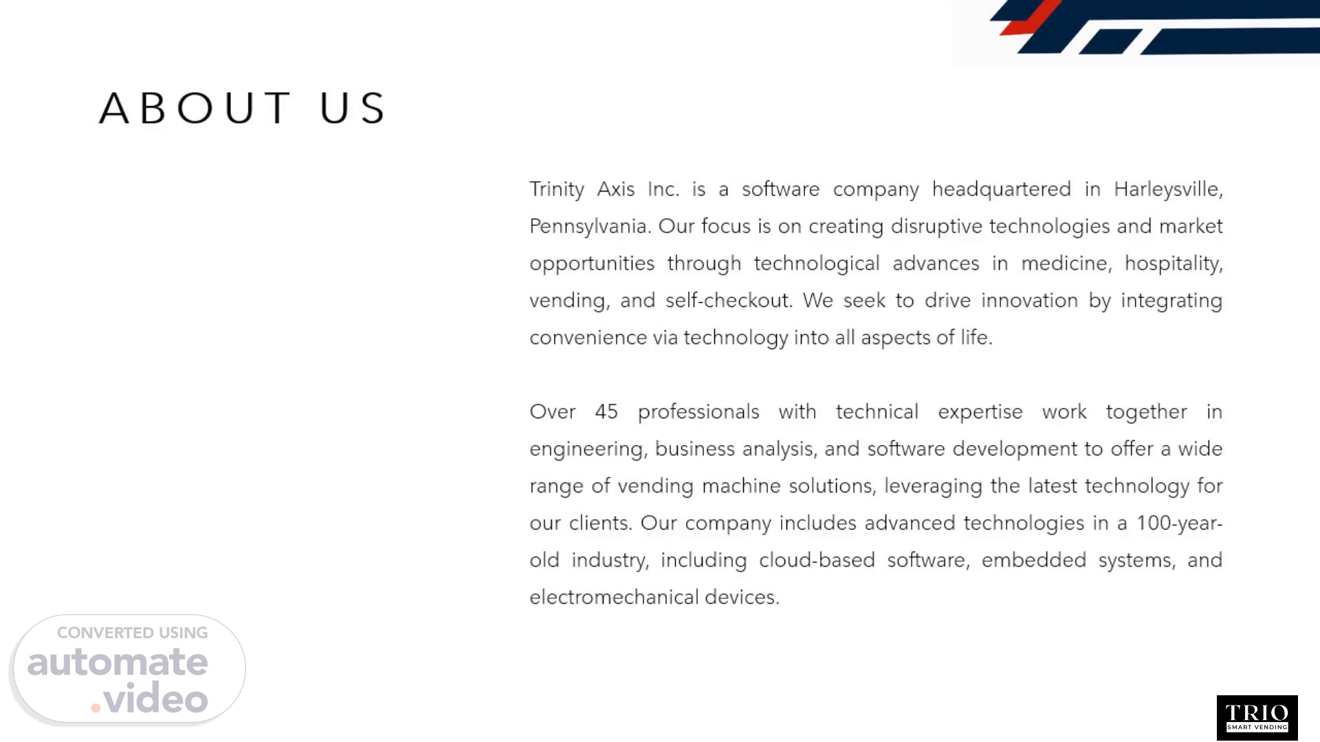 [Audio] We at Trinity Axis Inc. are committed to developing disruptive technologies and creating new market opportunities through our top-of-the-line technological innovations. Our extensive range of vending machine solutions uses the most up-to-date technology to offer our customers maximum convenience. Our contactless payment system T-R-I-O is just one example of our mission to make life easier with the power of technology. Visit us at 2060 Detwiler Road Suite 101 Harleysville PA 19438 give us a call on plus 1 (484) 964-5500 or email us at [email protected]. Thank you for your time and for listening..