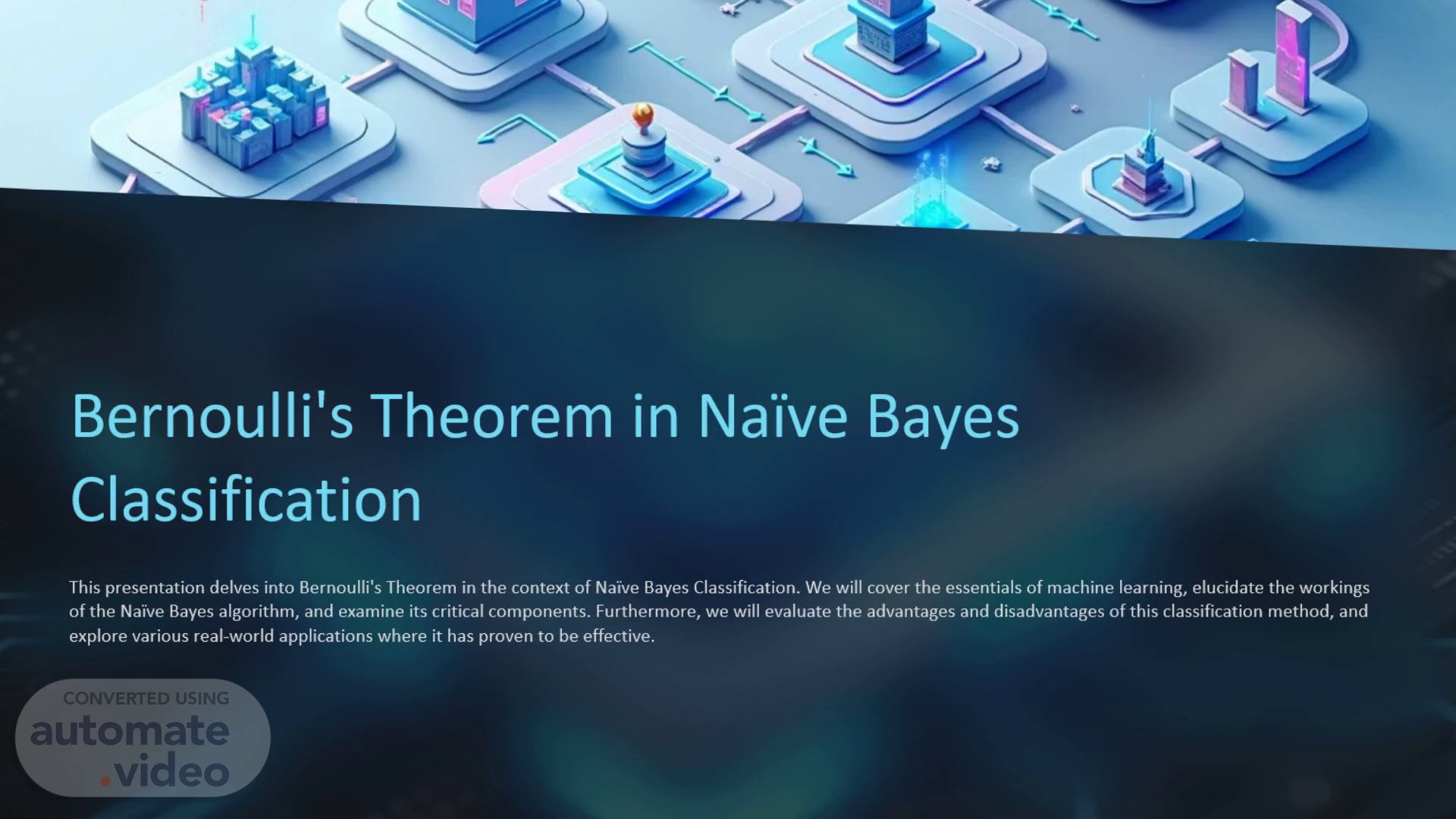 [Audio] Bernoulli's Theorem in Naïve Bayes Classification This presentation delves into Bernoulli's Theorem in the context of Naïve Bayes Classification. We will cover the essentials of machine learning, elucidate the workings of the Naïve Bayes algorithm, and examine its critical components. Furthermore, we will evaluate the advantages and disadvantages of this classification method, and explore various real-world applications where it has proven to be effective..