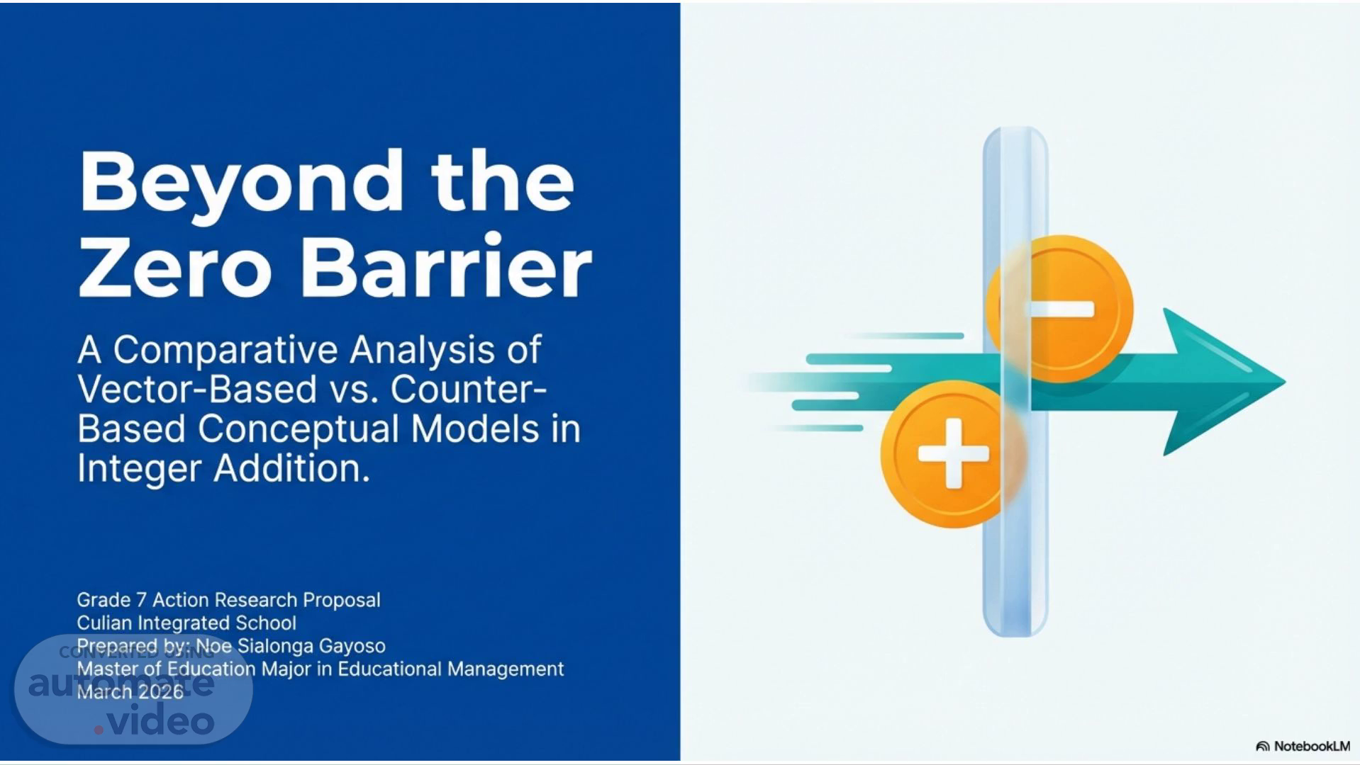 Beyond the Zero Barrier A Comparative Analysis of Vector-Based vs. Counter- Based Conceptual Models in Integer Addition. Grade 7 Action Research Proposal Culian Integrated School Prepared by: Noe Sialonga Gayoso Master of Education Major in Educational Management March 2026 NotebookLM.