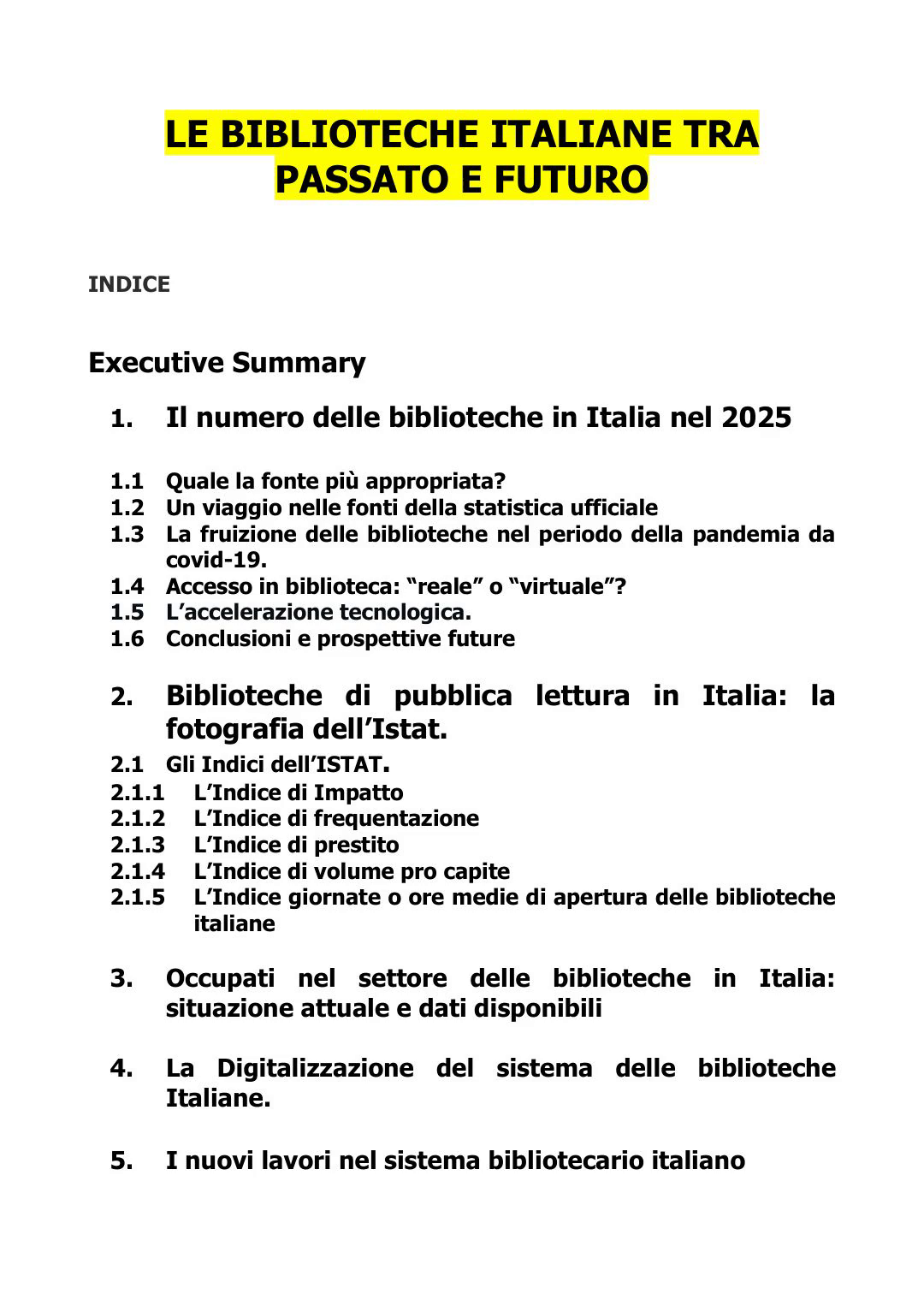 LE BIBLIOTECHE ITALIANE TRA PASSATO E FUTURO INDICE Executive Summary 1. Il numero delle biblioteche in Italia nel 2025 1.1 Quale la fonte più appropriata? 1.2 Un viaggio nelle fonti della statistica ufficiale 1.3 La fruizione delle biblioteche nel periodo della pandemia da covid-19. 1.4 Accesso in biblioteca: “reale” o “virtuale”? 1.5 L’accelerazione tecnologica. 1.6 Conclusioni e prospettive future 2. Biblioteche di pubblica lettura in Italia: la fotografia dell’Istat. 2.1 Gli Indici dell’ISTAT. 2.1.1 L’Indice di Impatto 2.1.2 L’Indice di frequentazione 2.1.3 L’Indice di prestito 2.1.4 L’Indice di volume pro capite 2.1.5 L’Indice giornate o ore medie di apertura delle biblioteche italiane 3. Occupati nel settore delle biblioteche in Italia: situazione attuale e dati disponibili 4. La Digitalizzazione del sistema delle biblioteche Italiane. 5. I nuovi lavori nel sistema bibliotecario italiano.