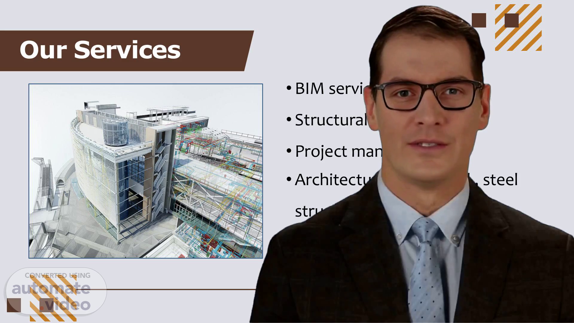 [Virtual Presenter] Our Services BIM services Structural engineering Project management Architecture , structural , steel structure . MEP design Value engineering 01.