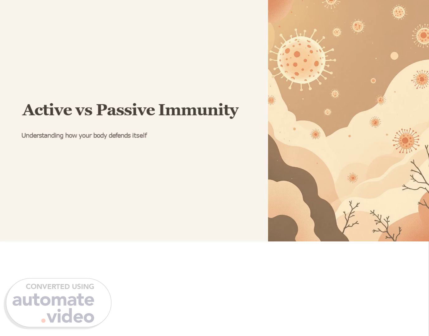 [Audio] What is Active Immunity? Self-Generated Defense Your immune system creates its own antibodies after pathogen exposure Natural or Artificial Develops through infection recovery or vaccination Long-Term Memory Builds immunological memory for lasting, sometimes lifelong protection Delayed but Durable Takes days to weeks to develop but provides robust, enduring defense What is Active Immunity? First, let's talk about Active Immunity. This is what most of us typically think of when we hear the word 'immunity.' The key idea here is that it's a self-generated defense. 3 This means your own immune system is the one doing the work. It actively creates its own antibodies after it's been exposed to a pathogen, like a virus or bacteria. There are two main ways we can develop this active immunity: naturally or artificially. Natural active immunity is what you get after you've been sick and have recovered from an infection. For example, if you get chickenpox, your body fights it off, and for the rest of your life, your immune system "remembers" that specific virus and can defeat it before it makes you sick again. Artificial active immunity is what we get from vaccination. A vaccine introduces a safe, weakened, or partial form of the pathogen to your body. This isn't enough to make you truly sick, but it's enough to trigger your immune system to build a full-scale defense. It's like a training manual for your body. The most important feature of active immunity is that it creates long-term memory. It builds what we call "immunological memory," which provides lasting, and sometimes even lifelong, protection. However, this powerful protection isn't instant. It's delayed but durable. After an infection or a vaccination, it can take several days or even weeks for your body to develop this full defense. But the wait is worth it, because the defense it builds is robust and stays with you for a long time..
