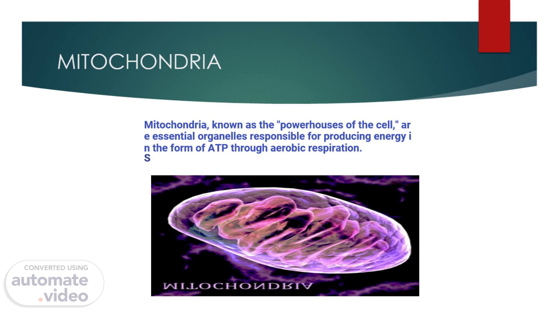 [Audio] Mitochondria, known as the "powerhouses of the cell," are essential organelles responsible for producing energy in the form of ATP through aerobic respiration. S.