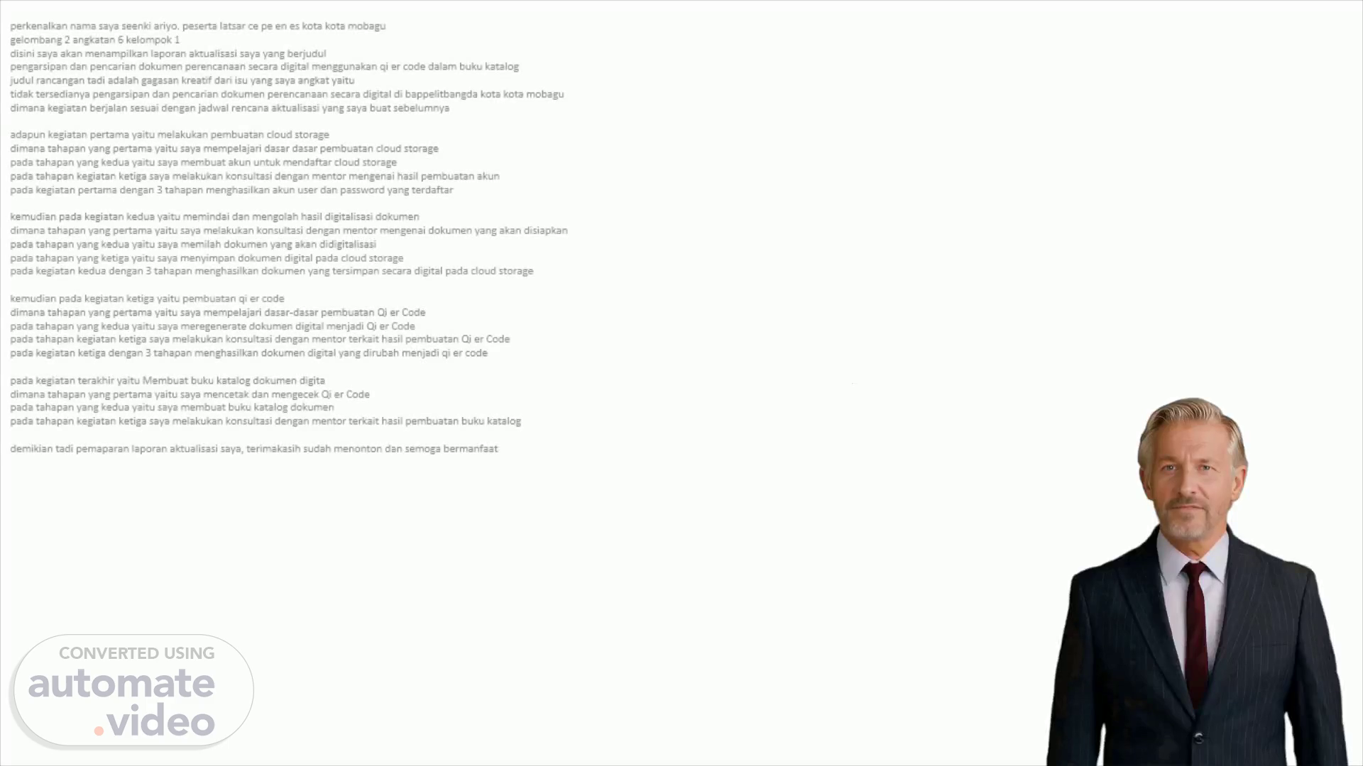 [Virtual Presenter] Salam Sejahtera. Saya Seenki Ariyo, seorang peserta Latsar CE PE EN ES di Kota Kota Mobagu Gelombang 2 Angkatan 6 Kelompok 1. Saya telah berhasil merancang dan aktualisasi gagasan kreatif mengenai pengarsipan dan pencarian dokumen perencanaan secara digital menggunakan Qi er Code dalam buku katalog. Isu yang diangkat adalah tidak tersedianya pengarsipan dan pencarian dokumen perencanaan secara digital di Bappelitbangda Kota Kota Mobagu. Kegiatan dijalankan sesuai dengan jadwal rencana aktualisasi yang saya buat sebelumnya, meliputi pembuatan cloud storage, memindai dan mengolah hasil digitalisasi dokumen, serta pembuatan Qi er Code. Semoga presentasi ini bisa menjadi salah satu kontribusi saya bagi Pemerintah Kota Kota Mobagu. Terima kasih..