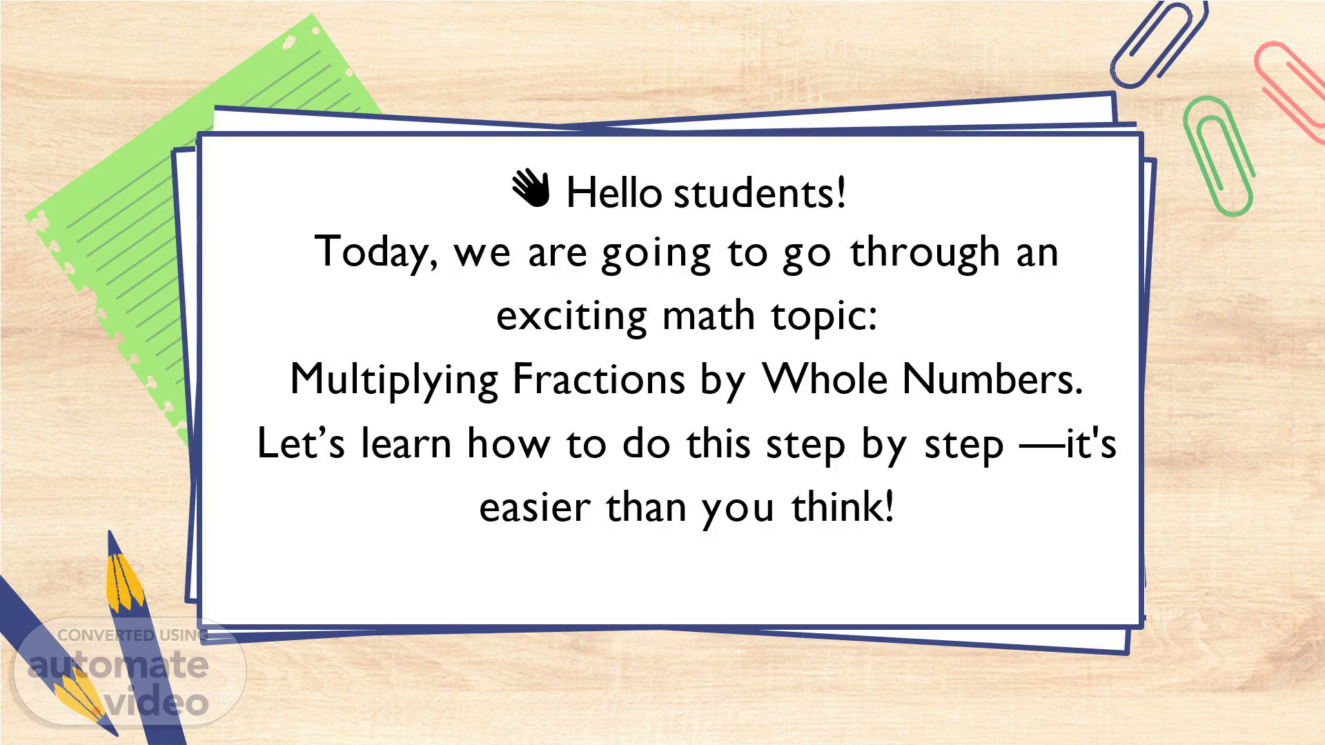 [Audio] 👋 Hello students! Today, we are going to go through an exciting math topic: Multiplying Fractions by Whole Numbers. Let’s learn how to do this step by step — it's easier than you think! Hello Students! Today, we are going to go through an exciting math topic: Multiplying fractions by whole numbers. Let's learn how to do this step by step…. It is easier than you think..