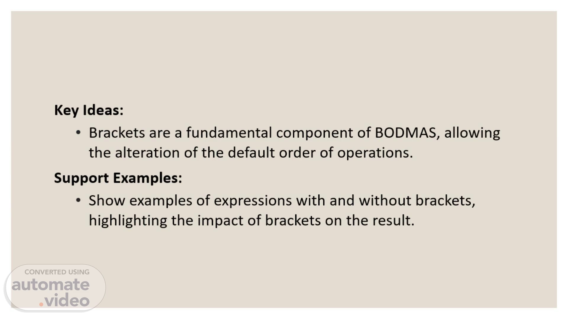 [Audio] Welcome to our presentation on BODMAS, the order of operations in mathematics. BODMAS stands for Brackets, Orders, Division and Multiplication, Addition and Subtraction. It's a fundamental rule to follow in mathematical calculations. Today, we'll focus on the 'B' in BODMAS – Brackets. Brackets play a crucial role in altering the default order of operations, and understanding their significance is key to accurate mathematical results. Let's dive in..