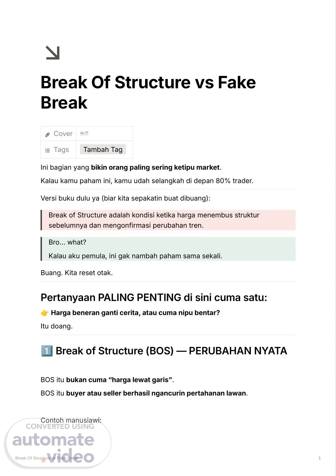Downtrend Lower high & lower low Terus harga naik dan nutup di atas lower high terakhir Artinya apa? “Seller gagal nahan. Buyer ambil alih.” Itu BOS valid. Ciri BOS sehat: Close candle jelas (bukan cuma wick) Setelah BOS, harga gak langsung balik Struktur lama rusak Fake Break — TIPU-TIPU HALUS Fake break itu favorit market buat nyedot emosi kamu. Ceritanya: Harga tembus high / low Kamu masuk Terus… plak… harga balik arah Kenapa? Break Of Structure vs Fake Break 2.