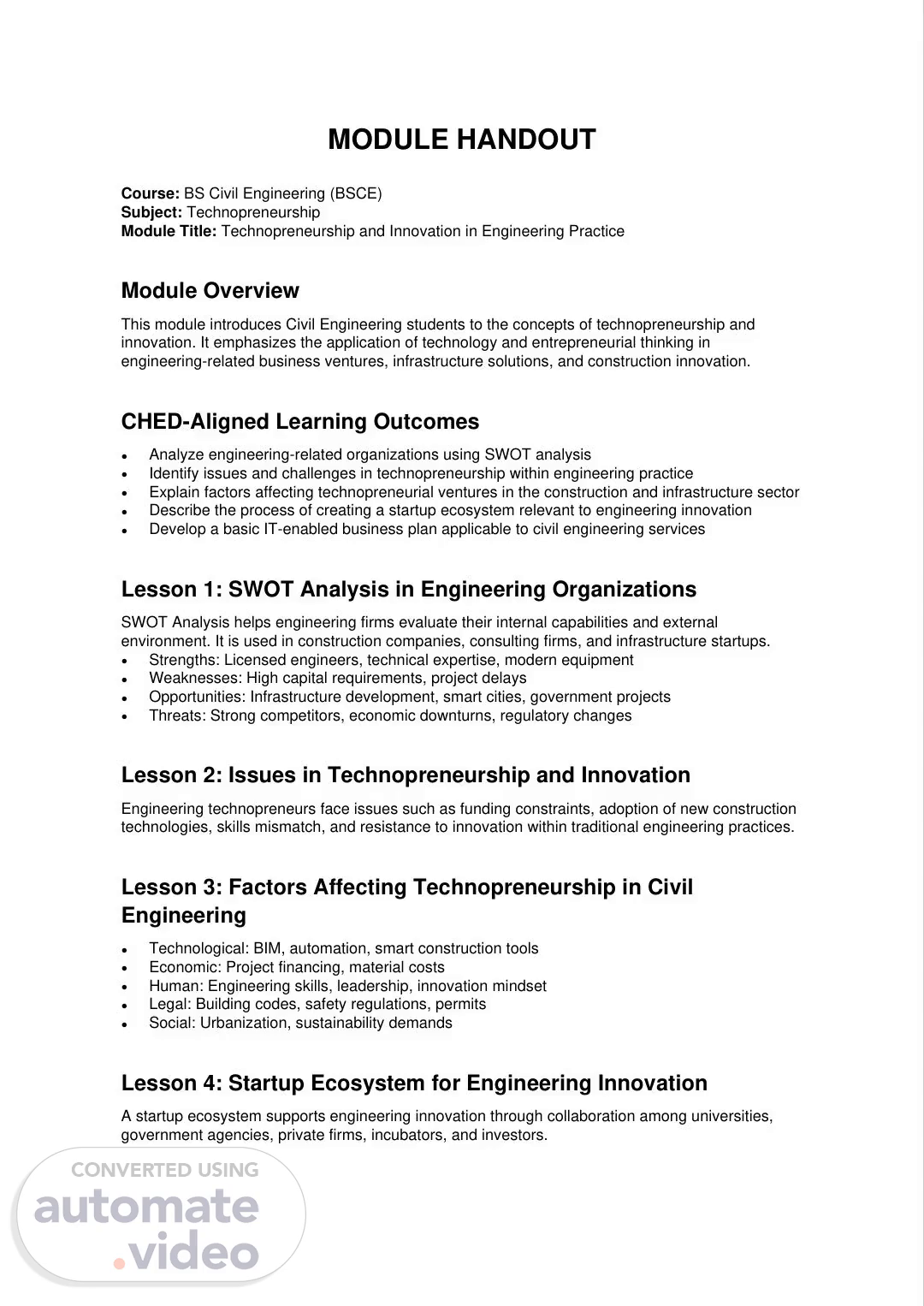 [Audio] module HANDOUT Course: BS Civil Engineering (B-S-C-E-) Subject: Technopreneurship Module Title: Technopreneurship and Innovation in Engineering Practice Module Overview This module introduces Civil Engineering students to the concepts of technopreneurship and innovation. It emphasizes the application of technology and entrepreneurial thinking in engineering related business ventures, infrastructure solutions, and construction innovation. CHED-Aligned Learning Outcomes Analyze engineering related organizations using Swot analysis Identify issues and challenges in technopreneurship within engineering practice Explain factors affecting technopreneurial ventures in the construction and infrastructure sector Describe the process of creating a startup ecosystem relevant to engineering innovation Develop a basic IT-enabled business plan applicable to civil engineering services Lesson 1: Swot Analysis in Engineering Organizations Swot Analysis helps engineering firms evaluate their internal capabilities and external environment. It is used in construction companies, consulting firms, and infrastructure startups. Strengths: Licensed engineers, technical expertise, modern equipment Weaknesses: High capital requirements, project delays Opportunities: Infrastructure development, smart cities, government projects Threats: Strong competitors, economic downturns, regulatory changes Lesson 2: Issues in Technopreneurship and Innovation Engineering technopreneurs face issues such as funding constraints, adoption of new construction technologies, skills mismatch, and resistance to innovation within traditional engineering practices. Lesson 3: Factors Affecting Technopreneurship in Civil Engineering Technological: B-I-M--, automation, smart construction tools Economic: Project financing, material costs Human: Engineering skills, leadership, innovation mindset Legal: Building codes, safety regulations, permits Social: Urbanization, sustainability demands Lesson 4: Startup Ecosystem for Engineering Innovation A startup ecosystem supports engineering innovation through collaboration among universities, government agencies, private firms, incubators, and investors..