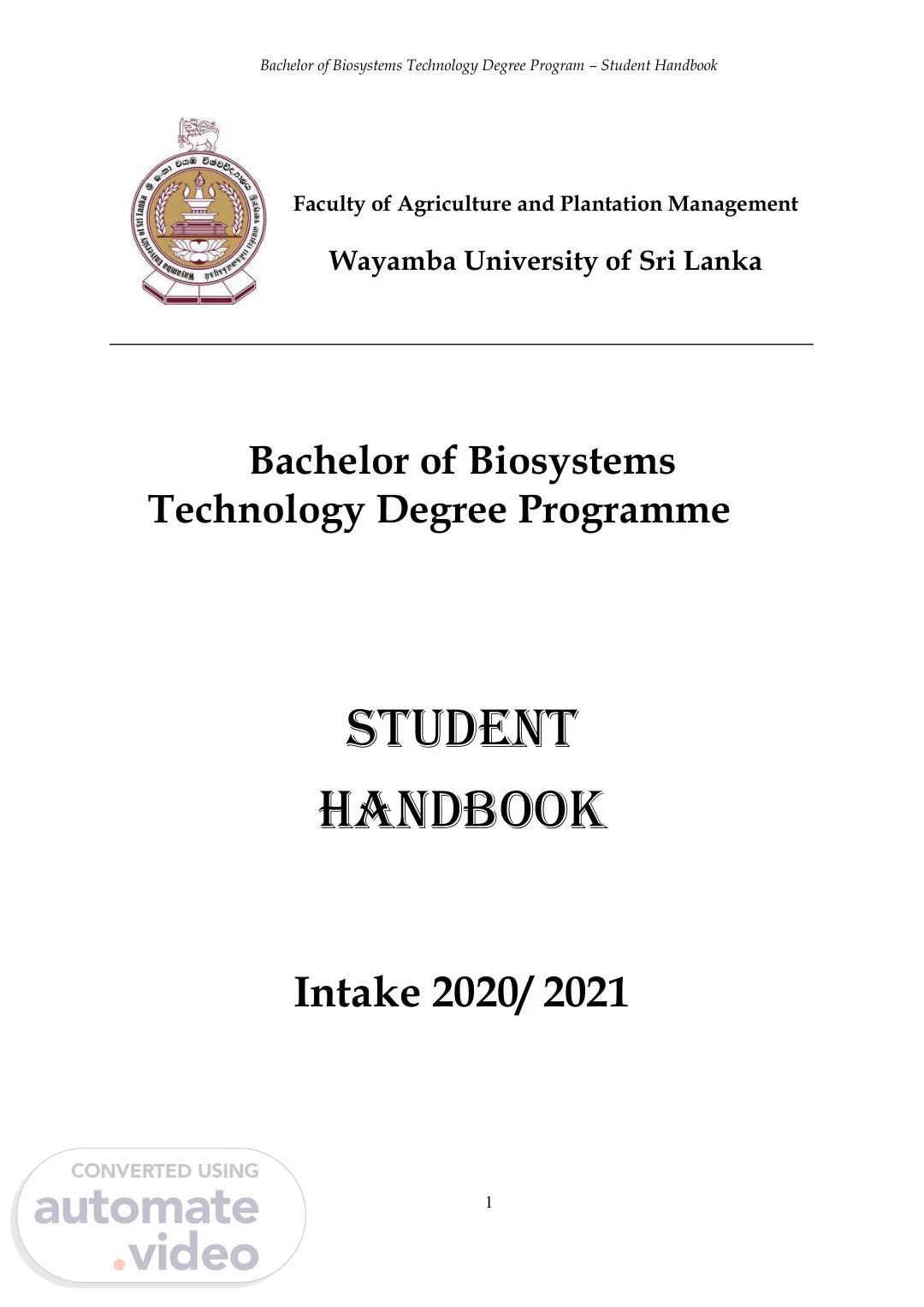 Bachelor of Biosystems Technology Degree Program – Student Handbook 2 Students are strongly advised to obtain a copy of the ‘By-Laws’ and the document on ‘examination, procedure, offences and punishments’ of the Wayamba University of Sri Lanka at the time of their registration and adhere to them throughout the study period at the university.