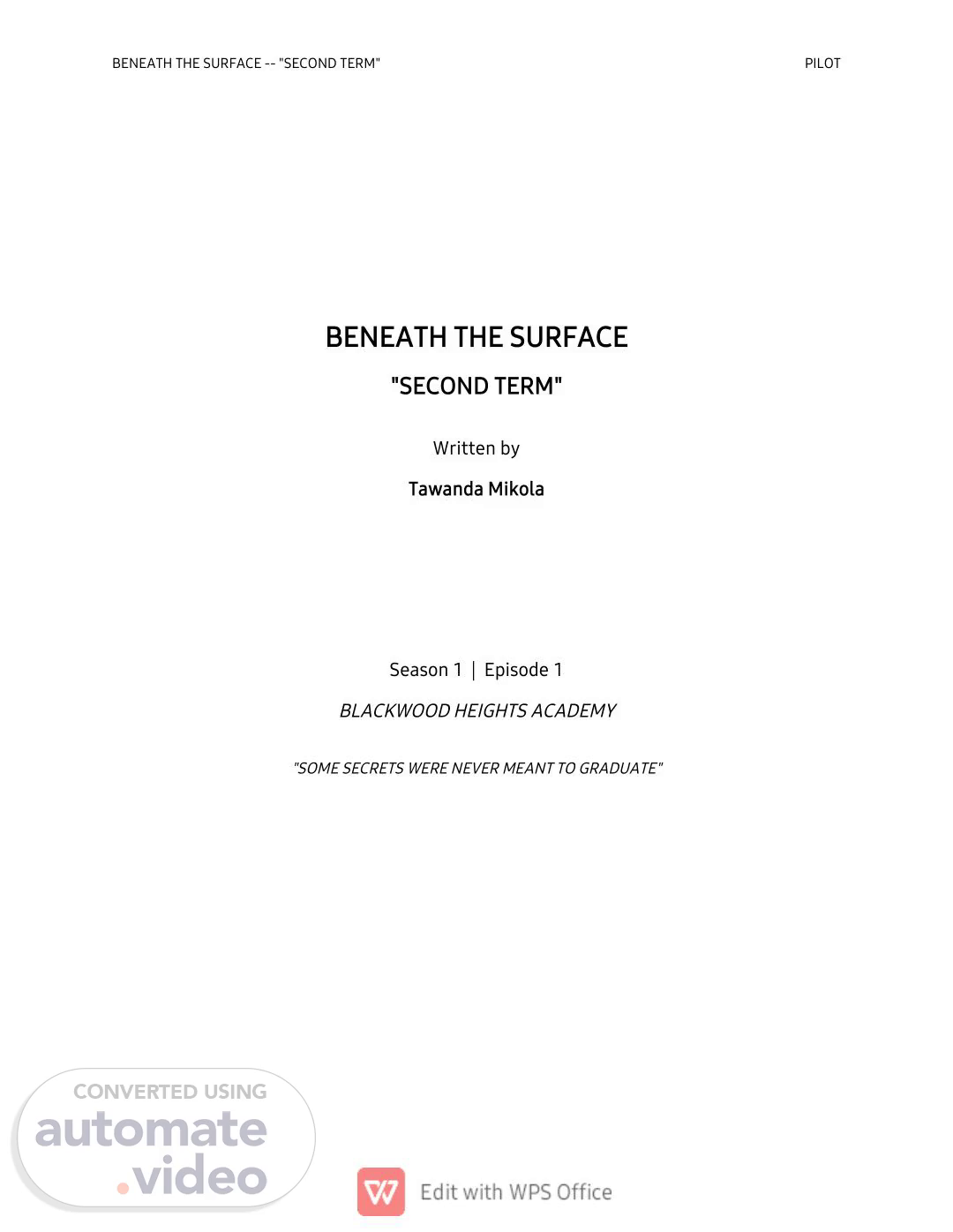 BENEATH THE SURFACE -- "SECOND TERM" PILOT BENEATH THE SURFACE "SECOND TERM" Written by Tawanda Mikola Season 1 | Episode 1 BLACKWOOD HEIGHTS ACADEMY "SOME SECRETS WERE NEVER MEANT TO GRADUATE".
