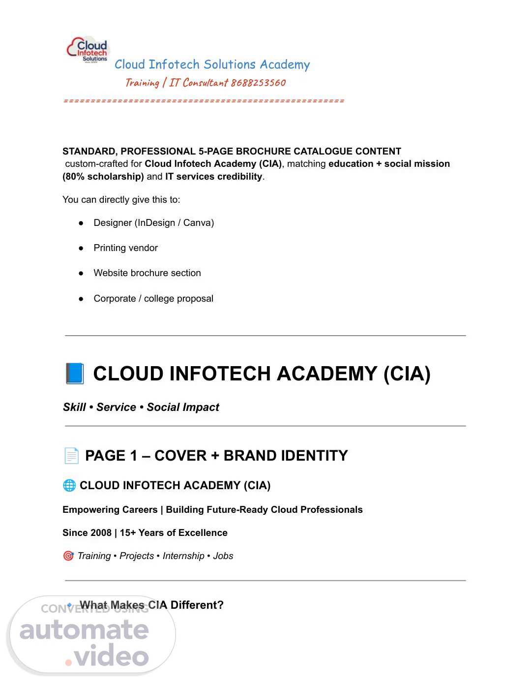 Cloud Infotech Solutions Academy Training | IT Consultant 8688253560 ==================================================== STANDARD, PROFESSIONAL 5-PAGE BROCHURE CATALOGUE CONTENT custom-crafted for Cloud Infotech Academy (CIA), matching education + social mission (80% scholarship) and IT services credibility. You can directly give this to: β Designer (InDesign / Canva) β Printing vendor β Website brochure section β Corporate / college proposal π CLOUD INFOTECH ACADEMY (CIA) Skill β’ Service β’ Social Impact π PAGE 1 β COVER + BRAND IDENTITY π CLOUD INFOTECH ACADEMY (CIA) Empowering Careers | Building Future-Ready Cloud Professionals Since 2008 | 15+ Years of Excellence π― Training β’ Projects β’ Internship β’ Jobs πΉ What Makes CIA Different?.