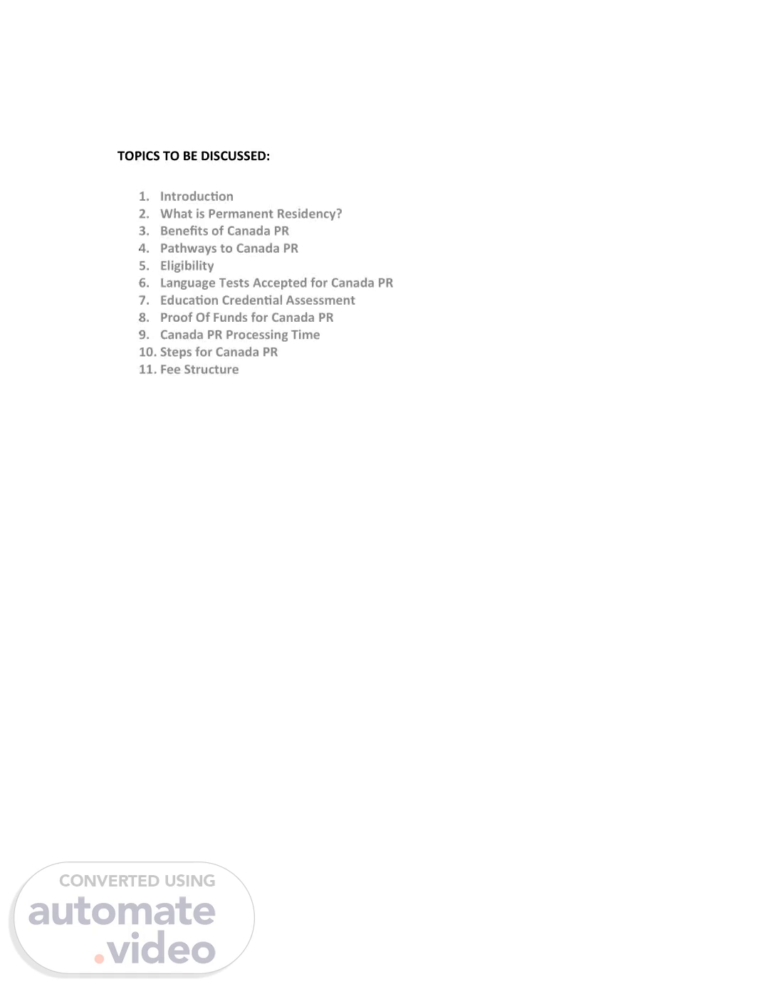 [Audio] 3. Family Sponsorship: Canadian ci�zens and Permanent Residents have the opportunity to sponsor their eligible family members for Canadian Permanent Residency. Family sponsorship allows individuals to reunite with their close family members and establish a new life together in Canada. Key points regarding family sponsorship include: Eligible Rela�onships: Canadian ci�zens and PR holders can typically sponsor their spouse or common-law partner, dependent children, parents, and grandparents. Sponsorship Requirements: Sponsors must meet specific eligibility criteria, including being a Canadian ci�zen or Permanent Resident, being at least 18 years old, and demonstra�ng the ability to financially support the sponsored family members. 5: Who is Eligible for Canada PR under Express Entry An applicant must score a minimum of 67 points out of 100 to be able to apply for a Canada PR visa under Express Entry. Here are the various criteria under which you can score points to meet the eligibility requirement: Educa�on (Maximum Points – 25) Work experience (Maximum Points – 15) Language ability (Maximum Points – 28) Age (Maximum Points – 12) Arranged employment (Maximum Points – 10) Adaptability (Maximum Points – 10).