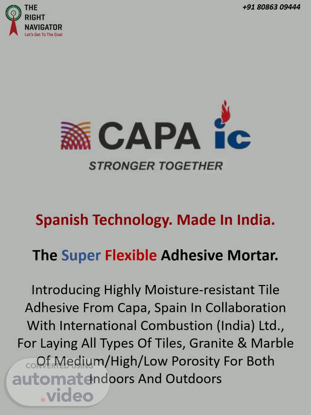 CAPA. Spanish Technology. Made In India. The Super Flexible Adhesive Mortar. Introducing Highly Moisture-resistant Tile Adhesive From Capa , Spain In Collaboration With International Combustion (India) Ltd., For Laying All Types Of Tiles, Granite & Marble Of Medium/High/Low Porosity For Both Indoors And Outdoors.