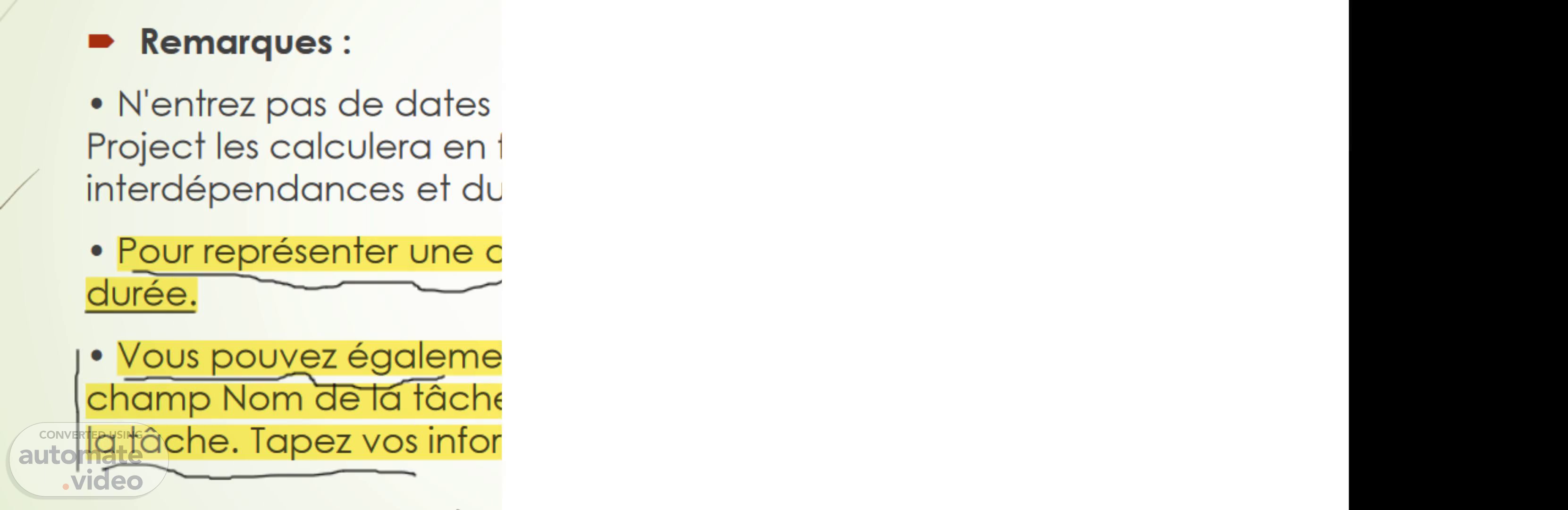 Remarques : • N'entrez pas de dates dans les champs Début et Fin de chaque tdche. MS Project les calculera en fonction de la date de début du projet, et des interdépendances et durées des taches. • Pour représenter une durée estimée, tapez un point d'interrogation apres la durée. • Vous POUVez également ajouter une remarque sur une tache. Dans le chZö--NÖRäö-T6fäche, sélectionnez la tdche, puis cliquez sur Remarques sur la tache. Tapez vos informations dans la zone Remarques, puis cliquez sur 0K..