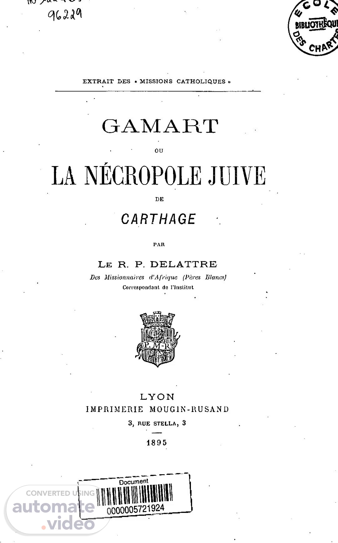 [Audio] ci 's EXTRAIT LIES MISSIONS CATHOLIQUES., GAMART ou LA NÉCROPOLE JUIVE DE CARTHAGE l'Ait LE R. P. DELATTRE Des 3lissionnahes d'ilfriquc (Pères Jilanet,J Correspondait do il ist tu t "Il stai LYON IMPRIMERIE MOUG1N-RUSAND 3, flUE STELLA, 3 1895 0.