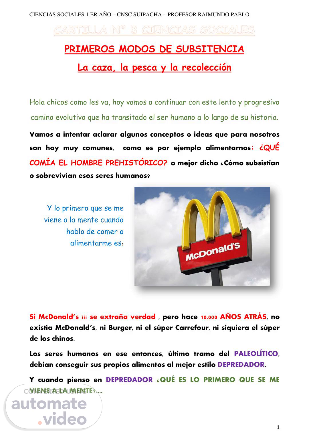 [Audio] CIENCIAS SOCIALES 1 ER AÑO – CNSC SUIPACHA – PROFESOR RAIMUNDO PABLO PRIMEROS MODOS DE SUBSITENCIA La caza, la pesca y la recolección Hola chicos como les va, hoy vamos a continuar con este lento y progresivo camino evolutivo que ha transitado el ser humano a lo largo de su historia. Vamos a intentar aclarar algunos conceptos o ideas que para nosotros son hoy muy comunes, como es por ejemplo alimentarnos: ¿QUÉ COMÍA EL HOMBRE PREHISTÓRICO? o mejor dicho ¿Cómo subsistían o sobrevivían esos seres humanos? Y lo primero que se me viene a la mente cuando hablo de comer o alimentarme es: Si McDonald's ¡¡¡ se extraña verdad , pero hace 10.000 AÑOS ATRÁS, no existía McDonald's, ni Burger, ni el súper Carrefour, ni siquiera el súper de los chinos. Los seres humanos en ese entonces, último tramo del PALEOLÍTICO, debían conseguir sus propios alimentos al mejor estilo DEPREDADOR. Y cuando pienso en DEPREDADOR ¿QUÉ ES LO PRIMERO QUE SE ME VIENE A LA MENTE?.... 1.