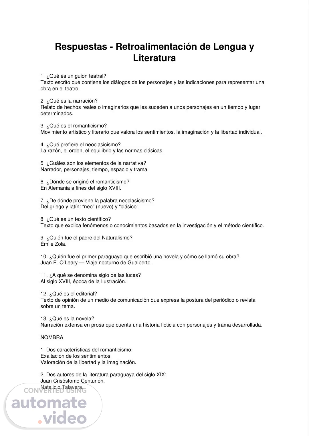 Respuestas - Retroalimentación de Lengua y Literatura 1. ¿Qué es un guion teatral? Texto escrito que contiene los diálogos de los personajes y las indicaciones para representar una obra en el teatro. 2. ¿Qué es la narración? Relato de hechos reales o imaginarios que les suceden a unos personajes en un tiempo y lugar determinados. 3. ¿Qué es el romanticismo? Movimiento artístico y literario que valora los sentimientos, la imaginación y la libertad individual. 4. ¿Qué prefiere el neoclasicismo? La razón, el orden, el equilibrio y las normas clásicas. 5. ¿Cuáles son los elementos de la narrativa? Narrador, personajes, tiempo, espacio y trama. 6. ¿Dónde se originó el romanticismo? En Alemania a fines del siglo XVIII. 7. ¿De dónde proviene la palabra neoclasicismo? Del griego y latín: “neo” (nuevo) y “clásico”. 8. ¿Qué es un texto científico? Texto que explica fenómenos o conocimientos basados en la investigación y el método científico. 9. ¿Quién fue el padre del Naturalismo? Émile Zola. 10. ¿Quién fue el primer paraguayo que escribió una novela y cómo se llamó su obra? Juan E. O’Leary — Viaje nocturno de Gualberto. 11. ¿A qué se denomina siglo de las luces? Al siglo XVIII, época de la Ilustración. 12. ¿Qué es el editorial? Texto de opinión de un medio de comunicación que expresa la postura del periódico o revista sobre un tema. 13. ¿Qué es la novela? Narración extensa en prosa que cuenta una historia ficticia con personajes y trama desarrollada. NOMBRA 1. Dos características del romanticismo: Exaltación de los sentimientos. Valoración de la libertad y la imaginación. 2. Dos autores de la literatura paraguaya del siglo XIX: Juan Crisóstomo Centurión. Natalicio Talavera..