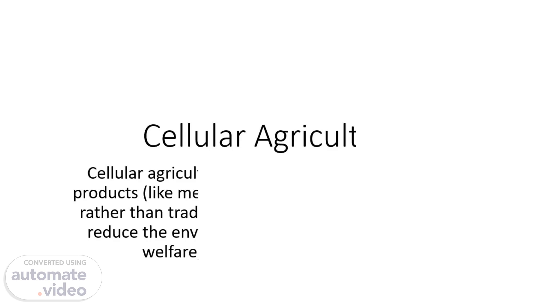 Cellular Agriculture. Cellular agriculture involves producing agricultural products (like meat, dairy, and eggs) from cell cultures rather than traditional farming. This method aims to reduce the environmental impact, improve animal welfare, and increase food security..