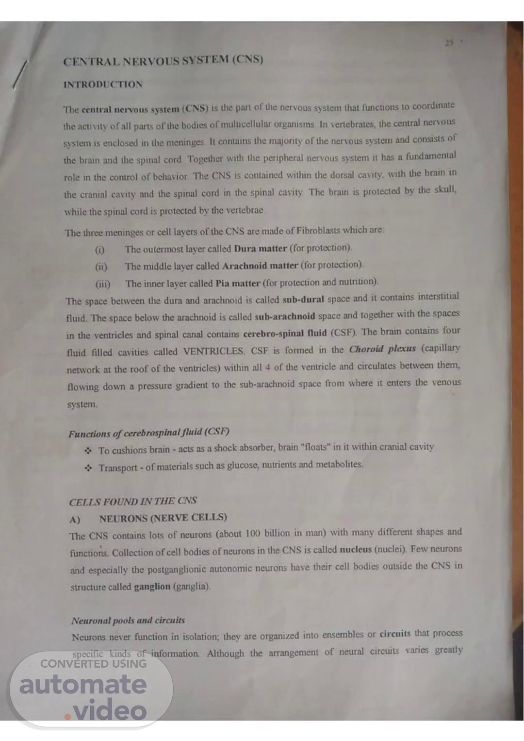 . . CENTRAL NERVOUS SYSTEM (CNS) INTRODUCTION central nervous sytem (CSS) ts the part of the nervous system that funcuons to coordinate the actH1ty of all parts or the bodies of multicellular organisms In vertebrates, the w•ntral nervous »stem IS enclosed in the meninges It contains the maJority of the nervous system and conststs of the bram and the spinal cord Together With the peripheral nervous system It has a fundamental role tn the control of behavior ne CNS •s contained within the dorsal cavity, wth the bram in the cranial cavity and the spinal cord in the spinal cavity The bram is protected by the skull, while the spinal cord is protected by the vertebrae The three memnges or cell layers of the CNS are made of Fibroblasts which are: (i) The outermost layer called Dura matter (for (ii) •Ihe middle layer called Arachnoid matter (for protection). (iii) *Ihe inner layer called Pia matter (for protection and nutrition). "Ihe space between the dura and arachnoid is called sub-dural space and it contains interstitial fluid. 'Ihe space below the arachnoid is called sub-arachnoid space and together with the spaces in the ventricles and spinal canal contains cerebro-spinal fluid (CSF). The bram contains four fluid filled cmities called VENTRICLES, CSF is formed in the Choroid plexus (capillary network at the roof of the ventricles) within all 4 of the ventricle and between them, flowing down a pressure gradient to the sub-arachnoid space from where it enters the venous system. Fu nctions of cerebrospinal fluid (CSF) + To cushions brain - acts as a shock absorber, brain "floats" in it within cranial cavity Transport - of materials such as glucose, nutrients and metabolites. CELLS' FOUND IN THE CNS A) NEURONS (NERVE CELLS) The CNS contains lots of neurons (about 100 billion in man) with many different shapes and functions. Collection of cell bodies of neurons in the CNS is called nucleus (nuclei). Few neurorrs and especially the postganglionic autonomic neurons have their cell tx»dies outside the CNS in structure called ganglion (ganglia), Neuronal pools and circuits Neurons never function in isolation; they are organind into ensembles or circuits that specific kinds of information Although the arrangement Of neural circuits variB greatly.