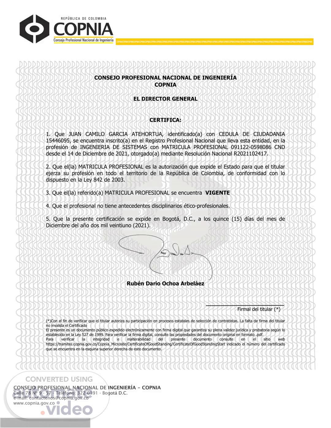 . . . CONSEJO PROFESIONAL NACIONAL DE INGENIERiA COPNIA EL DIRECTOR GENERA CERTIFICA: Que JUAN CAMILO GARCIA ATEHORTUA, identificado(a) con CEDULA DE CIUDADANIA 15446095, se encuentra inscrito(a) en el Registro Profesional Nacional que Ileva esta entidad, en la profesiön de INGENIERIA DE SISTEMAS con MATRICULA PROFESIONAL 091122-0598086 CND desde el 14 de Diciembre de 2021, otorgado(a) mediante Resoluciön Nacional R202110241 . Que el(la) MATRICULA PROFESIONAL es la autorizaciån que expide el Estado para que el titular ejerza su profesiön en todo el territorio de la Repüblica de Colombia, de conformidad con dispuesto en la Ley 842 de 2003. Que el(la) referido(a) MATRICULA PROFESIONAL se encuentra VIGENTE . Que el profesional no tiene antecedentes disciplinarios ético-profesionales. S. Que la presente certificaciån se expide en Bogotå, D.C., a IOS quince 05) dias del mes de Diciembre del afio dos mil veintiuno (2021). Rubén Dario Ochoa Arbelåez Firmal del titular (* (*)Con el fin de verificar que el titular autoriza su participaci6n en _procesos estatales de selecc•6n de contratistasßa falta de firma del titu no invalida el Certificado El presente es un documento püblico expedido electrånicamente con firma digital que garantiza su plena validez juridica y probatoria segün establecido en la Ley 527 de 1999. Para verificar la firma digital, consulte las del dtxumento original en formato .pdf. Para verificar la e inalterabilidad del presente documento consulte en https://tramites.copnia.gov.co/Copnia_Microsite/CertifiGteOfGoodStanding/CertificateOfGcodStandingStart indicado el nümero del certificÜ se encuentra en la esquina superior derecha de este documento DDDDDDDDDDDDDDDDDDDDDDDDDDDDDDDDDDDDDDDDDDDDDDDDDDDDDDDDDDDDDDDDDDD CONSEJO PROFESIONAL NACIONAL DE INGENIERiA - COPNIA Calle 78 NO 9 - 57 - Teléfono: 322 0191 - Bogotå D.C. e-mail: [email protected] www.copnia.gov.co.