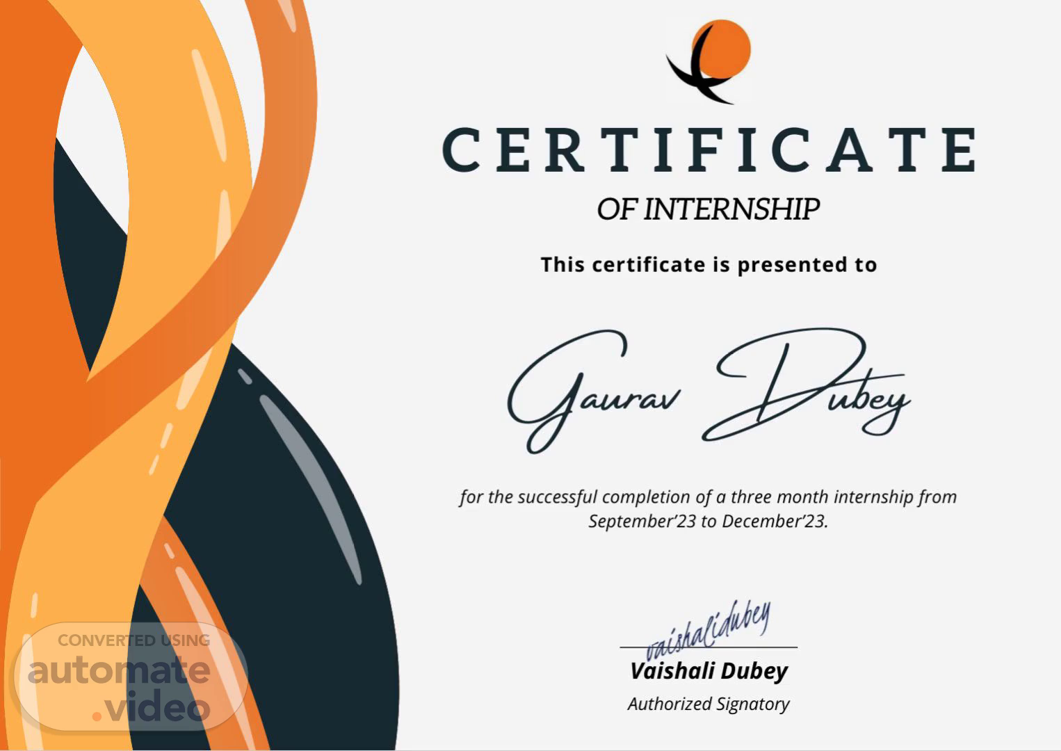 [Virtual Presenter] C E R T I F I C A T E OF INTERNSHIP This certificate is presented to Gaurav Dubey Vaishali Dubey Authorized Signatory for the successful completion of a three month internship from September’23 to December’23..