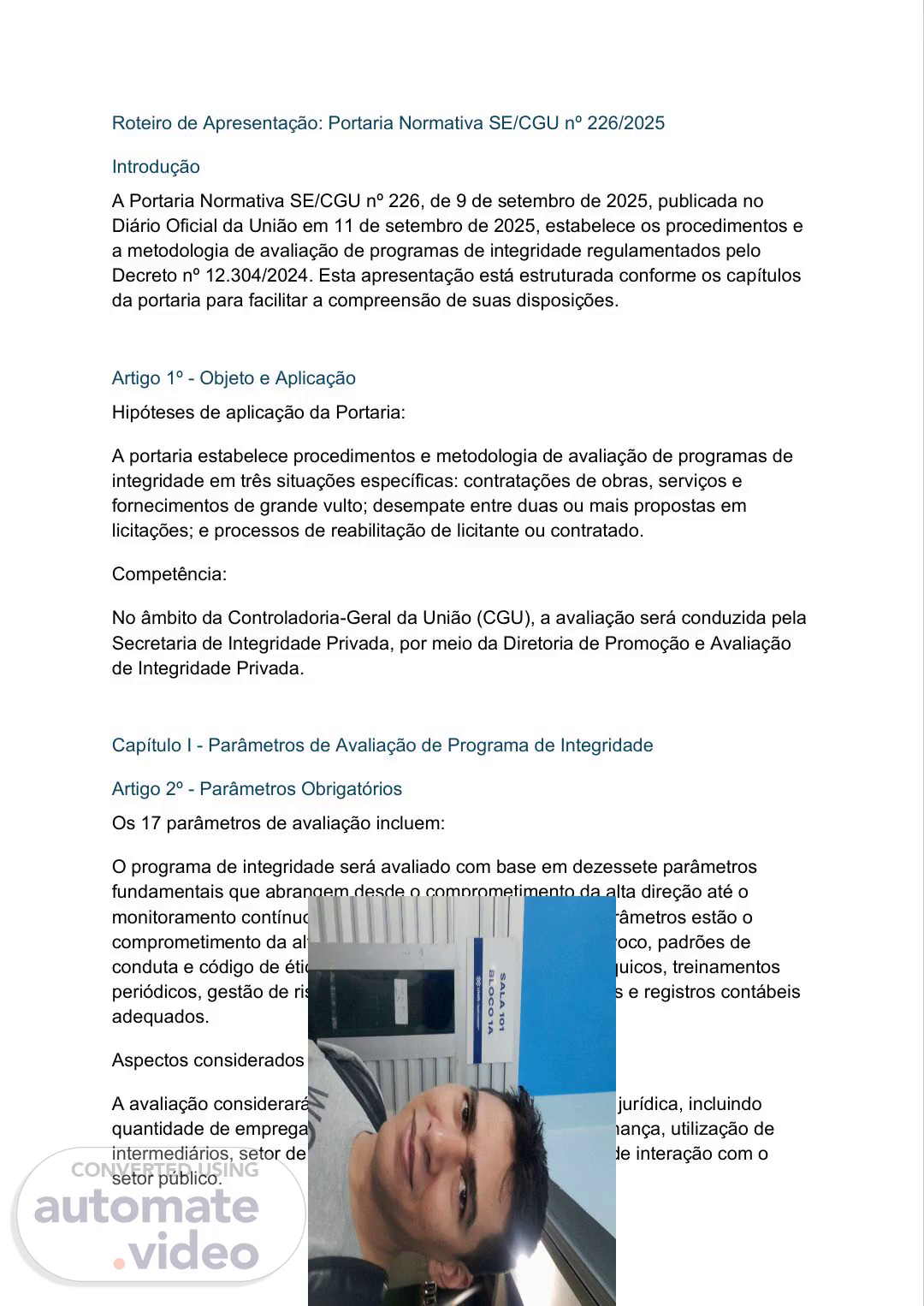 [Audio] Roteiro de Apresentação: Portaria Normativa SE/CGU nº 226/2025 Introdução A Portaria Normativa SE/CGU nº 226, de 9 de setembro de 2025, publicada no Diário Oficial da União em 11 de setembro de 2025, estabelece os procedimentos e a metodologia de avaliação de programas de integridade regulamentados pelo Decreto nº 12.304/2024. Esta apresentação está estruturada conforme os capítulos da portaria para facilitar a compreensão de suas disposições. Artigo 1º - Objeto e Aplicação Hipóteses de aplicação da Portaria: A portaria estabelece procedimentos e metodologia de avaliação de programas de integridade em três situações específicas: contratações de obras, serviços e fornecimentos de grande vulto; desempate entre duas ou mais propostas em licitações; e processos de reabilitação de licitante ou contratado. Competência: No âmbito da Controladoria-Geral da União (CGU), a avaliação será conduzida pela Secretaria de Integridade Privada, por meio da Diretoria de Promoção e Avaliação de Integridade Privada. Capítulo I - Parâmetros de Avaliação de Programa de Integridade Artigo 2º - Parâmetros Obrigatórios Os 17 parâmetros de avaliação incluem: O programa de integridade será avaliado com base em dezessete parâmetros fundamentais que abrangem desde o comprometimento da alta direção até o monitoramento contínuo do programa. Entre os principais parâmetros estão o comprometimento da alta direção com apoio visível e inequívoco, padrões de conduta e código de ética aplicáveis a todos os níveis hierárquicos, treinamentos periódicos, gestão de riscos de integridade, controles internos e registros contábeis adequados. Aspectos considerados na avaliação: A avaliação considerará o porte e especificidades da pessoa jurídica, incluindo quantidade de empregados, faturamento, estrutura de governança, utilização de intermediários, setor de mercado, países de atuação e grau de interação com o setor público..