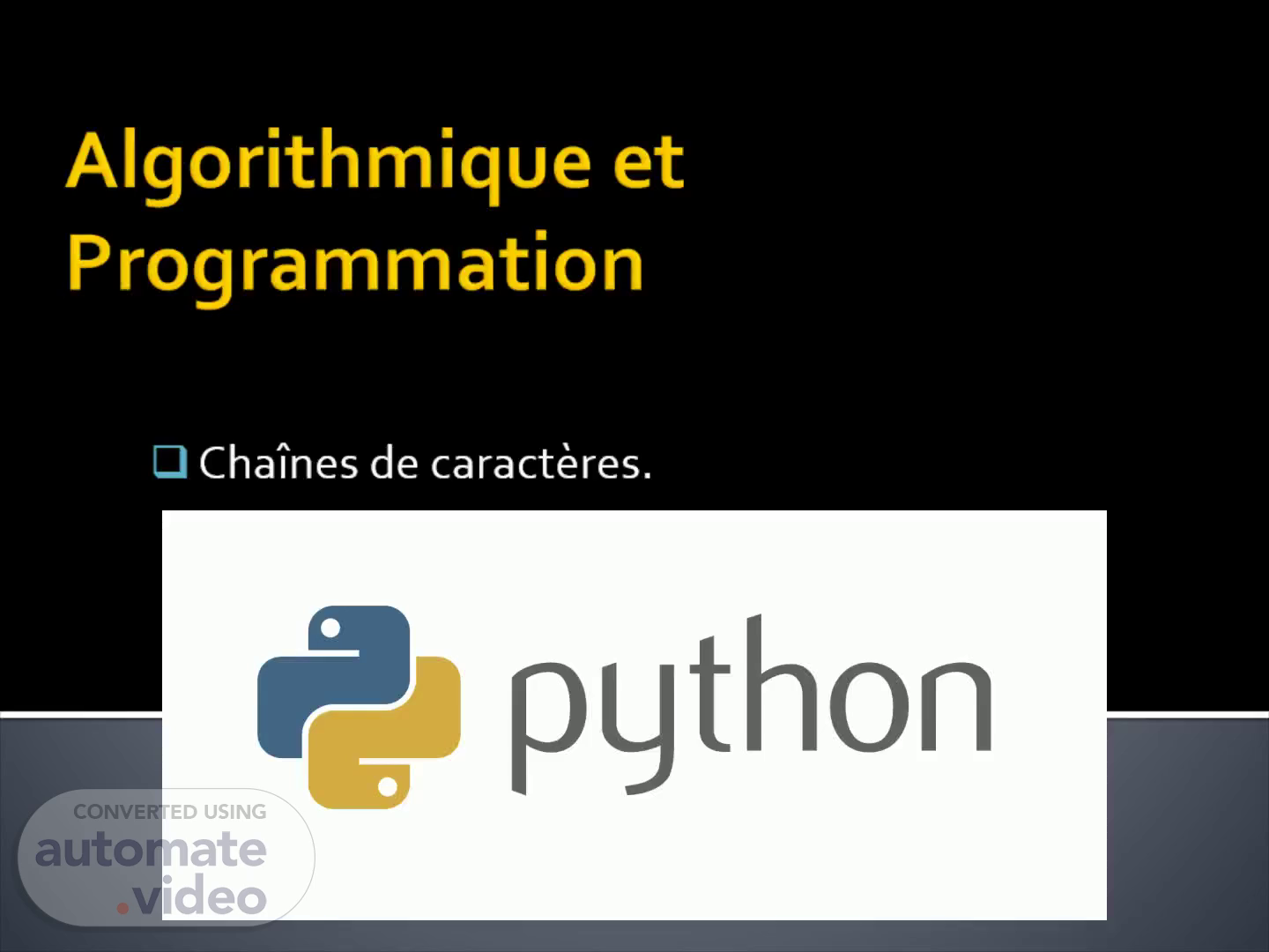 [Audio] Bonjour, Après avoir présenté dans la vidéo précédente, comment bien organiser un programme important constitué de plusieurs instructions, à travers sa décomposition en plusieurs sous-blocs à l' aide des procédures et des fonctions pour améliorer sa lisibilité et la réutilisabilité de ces sous-blocs. Aujourd'hui, on va continuer dans ce sens, en attaquant une autre entité algorithmique fondamentale, à savoir les chaines de caractères..