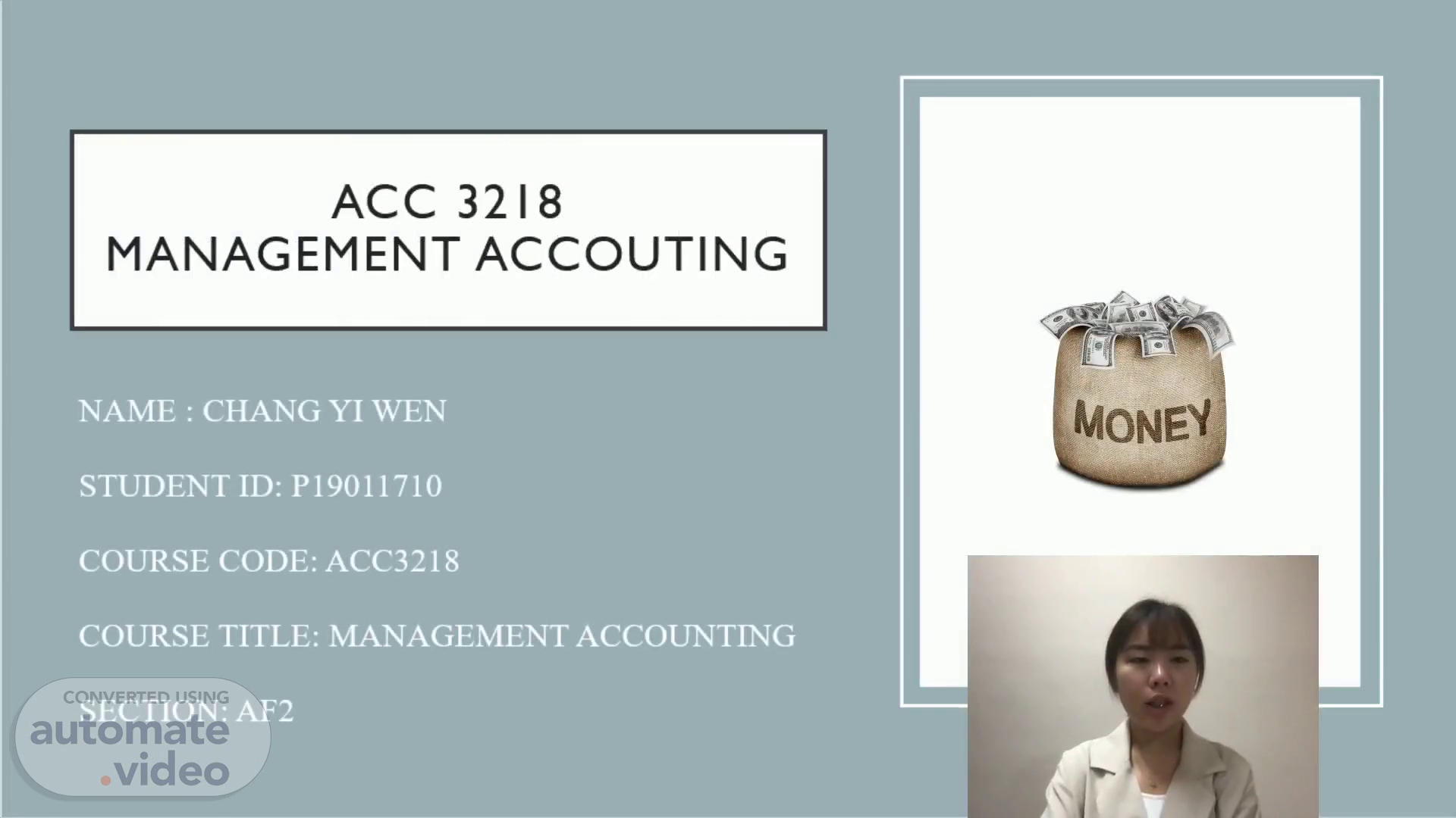ACC 3218 MANAGEMENT ACCOUTING. NAME : CHANG YI WEN STUDENT ID: P19011710 COURSE CODE: ACC3218 COURSE TITLE: MANAGEMENT ACCOUNTING SECTION: AF2.