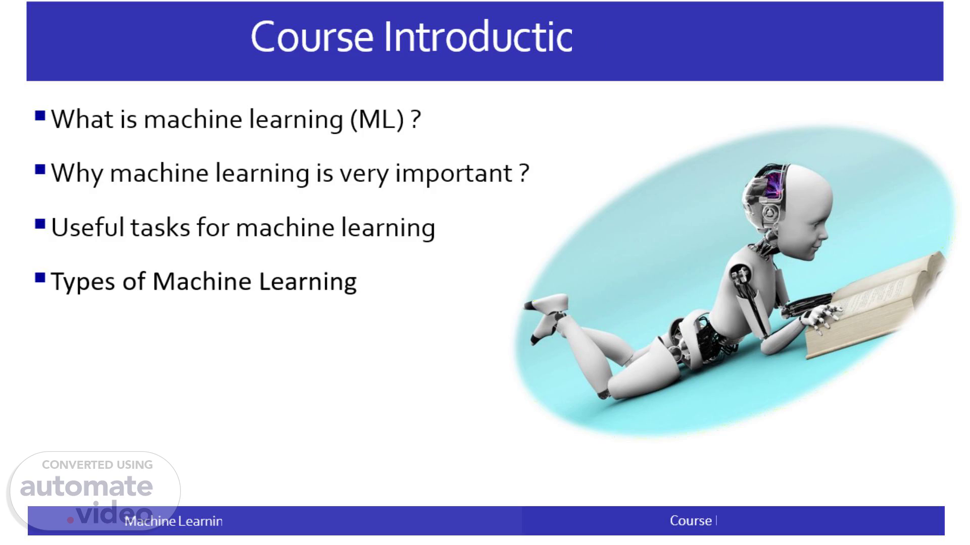 Course Introduction. What is machine learning (ML) ? Why machine learning is very important ? Useful tasks for machine learning Types of Machine Learning.