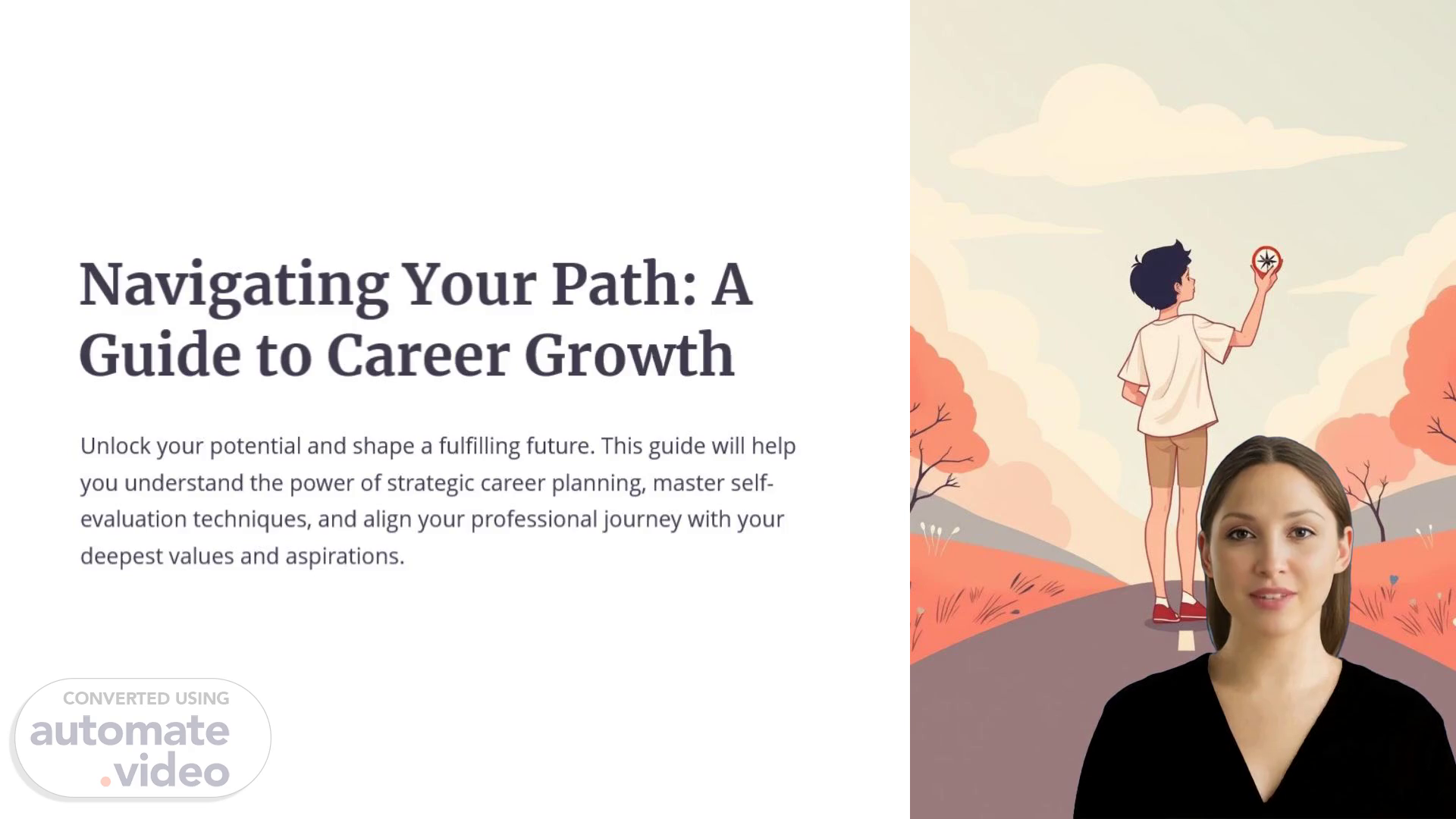 [Virtual Presenter] Navigating Your Path: A Guide to Career Growth Unlock your potential and shape a fulfilling future. This guide will help you understand the power of strategic career planning, master self evaluation techniques, and align your professional journey with your deepest values and aspirations..