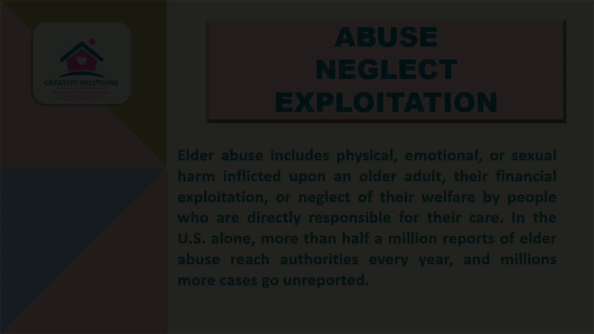 [Audio] ABUSE NEGLECT EXPLOITATION Elder abuse includes physical, emotional, or sexual harm inflicted upon an older adult, their financial exploitation, or neglect of their welfare by people who are directly responsible for their care. In the U.S. alone, more than half a million reports of elder abuse reach authorities every year, and millions more cases go unreported..