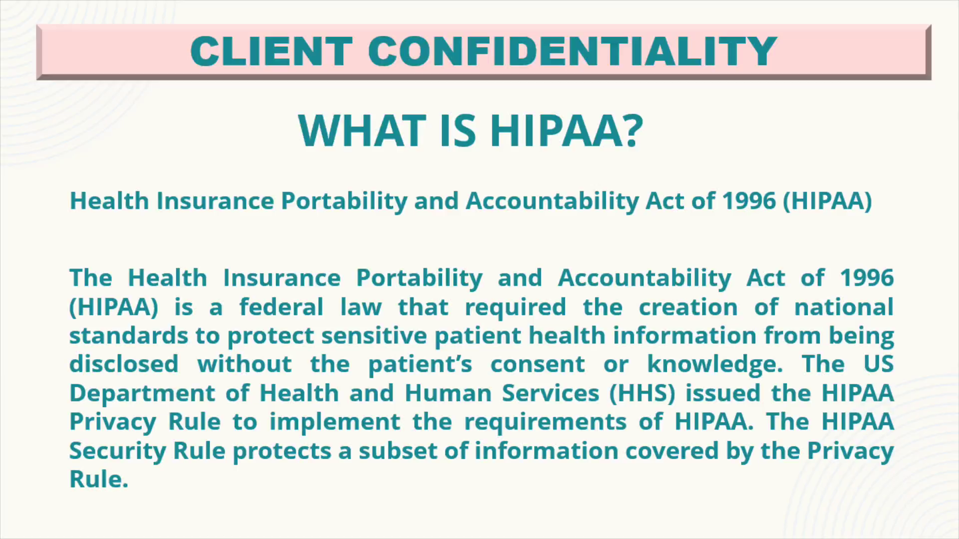 [Audio] Client confidentiality WHAT IS HIPAA? Health Insurance Portability and Accountability Act of 1996 (HIPAA) The Health Insurance Portability and Accountability Act of 1996 (HIPAA) is a federal law that required the creation of national standards to protect sensitive patient health information from being disclosed without the patient's consent or knowledge. The US Department of Health and Human Services (HHS) issued the HIPAA Privacy Rule to implement the requirements of HIPAA. The HIPAA Security Rule protects a subset of information covered by the Privacy Rule..