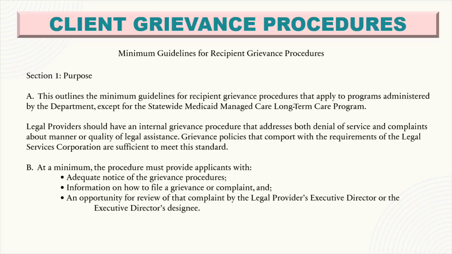 [Audio] Minimum Guidelines for Recipient Grievance Procedures Section 1: Purpose A. This outlines the minimum guidelines for recipient grievance procedures that apply to programs administered by the Department, except for the Statewide Medicaid Managed Care Long-Term Care Program. Legal Providers should have an internal grievance procedure that addresses both denial of service and complaints about manner or quality of legal assistance. Grievance policies that comport with the requirements of the Legal Services Corporation are sufficient to meet this standard. B. At a minimum, the procedure must provide applicants with: • Adequate notice of the grievance procedures; • Information on how to file a grievance or complaint, and; • An opportunity for review of that complaint by the Legal Provider's Executive Director or the Executive Director's designee..