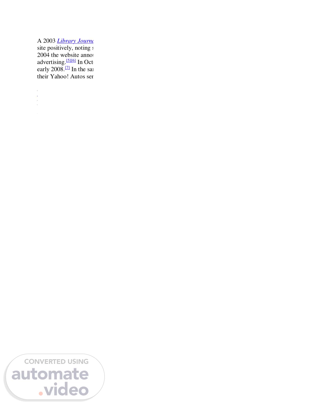 A 2003 Library Journal survey of automobile-related websites described cars.com as ranked the site positively, noting staff-written reviews that are signed, dated, detailed, and illustrated.[4] In 2004 the website announced a partnership with Kelley Blue Book and commenced national advertising.[5][6] In October 2007, it announced plans for its largest marketing campaign ever in early 2008.[7] In the same month, Yahoo! announced plans to receive listings from Cars.com for their Yahoo! Autos service.[8].