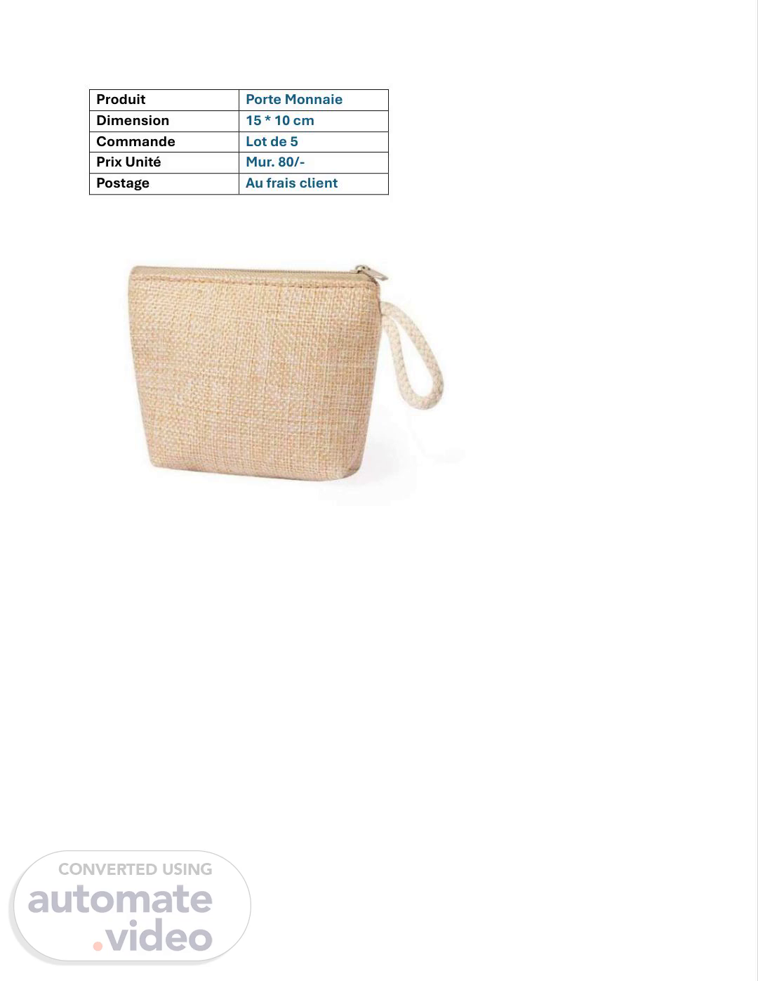 Produit Porte Monnaie Dimension 15 * 10 cm Commande Lot de 5 Prix Unité Mur. 80/- Postage Au frais client.
