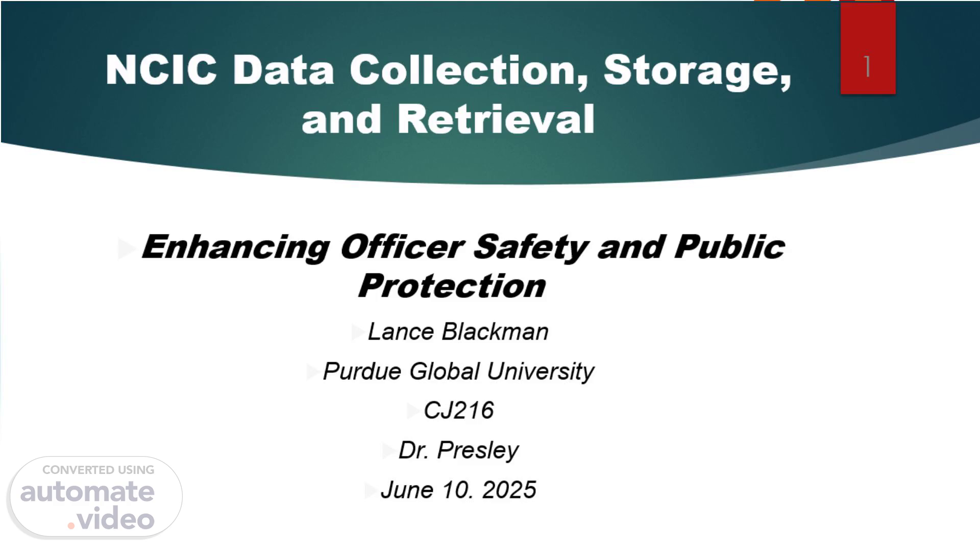 [Audio] Welcome to this presentation on the National Crime Information Center (NCIC) and its critical role in data collection, storage, and retrieval within the criminal justice system. We'll explore how NCIC operates, its importance for officer safety, and its practical applications in law enforcement operations like traffic stops..