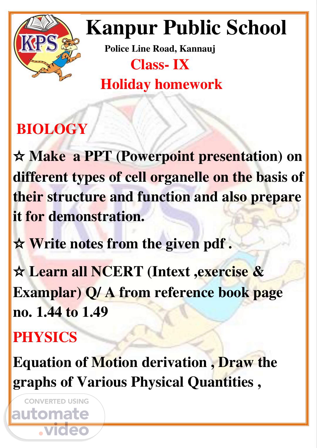 [Audio] Welcome students! For Biology your homework is to make a PowerPoint presentation on different types of cell organelles based on their structure and function. You are also required to prepare for demonstration and write notes from the given pdf. Additionally you must learn all N-C-E-R-T questions and answers from the reference book found on page 1.44-1.49. In Physics you need to do equation of motion derivation draw graphs of various physical quantities and complete additional work as directed..