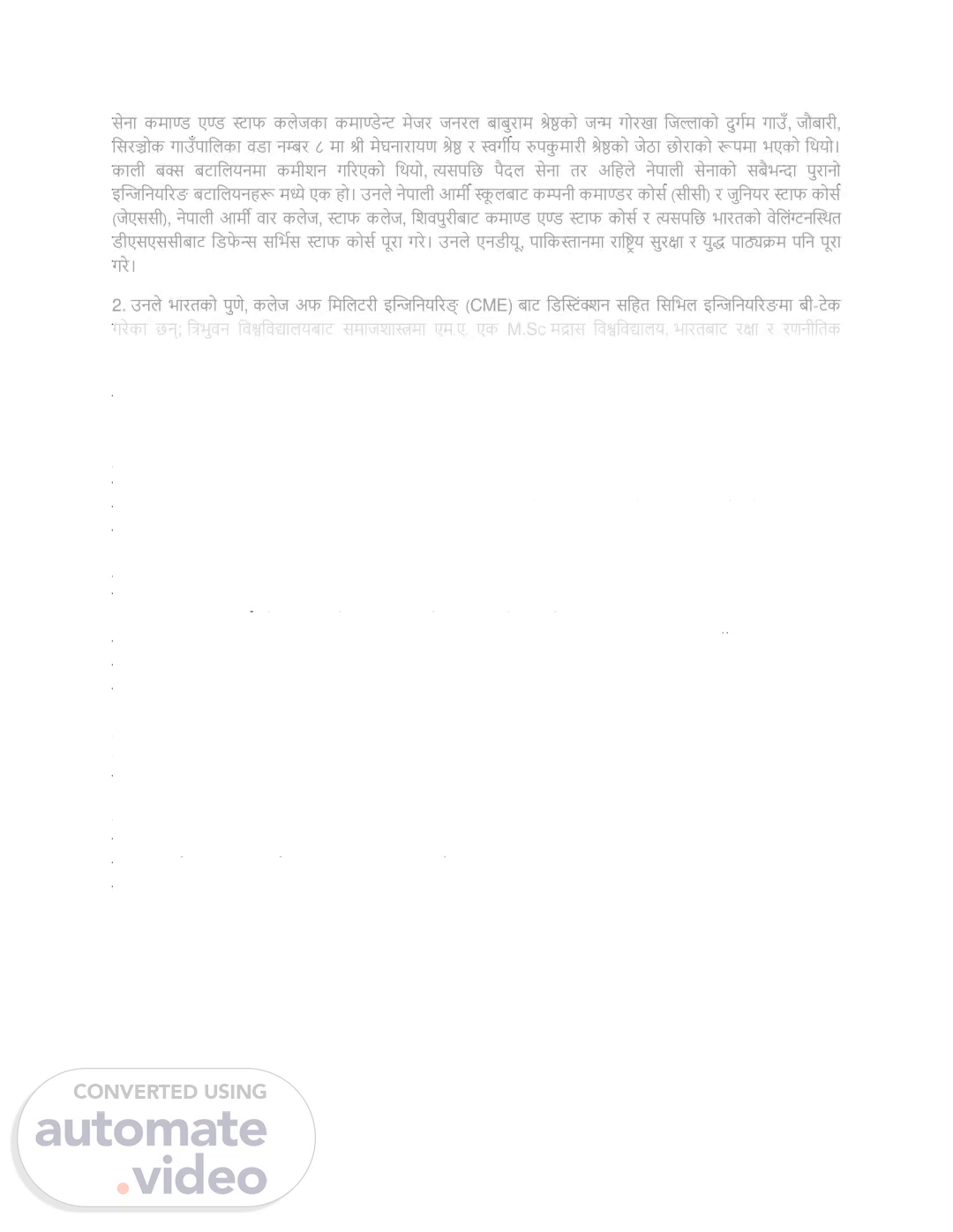 [Virtual Presenter] सेना कमाण्ड एण्ड स्टाफ कलेजका कमाण्डेन्ट मेजर जनरल बाबुराम श्रेष्ठको जन्म गोरखा जजल्लाको दुगगम गाउँ, जौबारी, जसरञ्चोक गाउँपाजलका वडा नम्बर ८ मा श्री मेघनारायण श्रेष्ठ र स्वगीय रुपकु मारी श्रेष्ठको जेठा छोराको रूपमा भएको जियो। काली बक्स बटाजलयनमा कमीशन गररएको जियो, त्यसपजछ पैदल सेना तर अजिले नेपाली सेनाको सबैभन्दा पुरानो इन्जजजनयररङ बटाजलयनिरू मध्ये एक िो। उनले नेपाली आमी स्कू लबाट कम्पनी कमाण्डर कोसग (सीसी) र जुजनयर स्टाफ कोसग (जेएससी), नेपाली आमी वार कलेज, स्टाफ कलेज, जशवपुरीबाट कमाण्ड एण्ड स्टाफ कोसग र त्यसपजछ भारतको वेजलिंग्टनन्थित डीएसएससीबाट जडफे न्स सजभगस स्टाफ कोसग पूरा गरे। उनले एनडीयू, पाजकस्तानमा राजरिय सुरक्षा र युद्ध पाठ्यक्रम पजन पूरा गरे। 2. उनले भारतको पुणे, कलेज अफ जमजलटरी इन्जजजनयररङ् (CME) बाट जडन्स्टिंक्शन सजित जसजभल इन्जजजनयररङमा बी-टेक गरेका छन्; जिभुवन जवश्वजवद्यालयबाट समाजशास्त्रमा एम.ए. एक M.Sc मद्रास जवश्वजवद्यालय, भारतबाट रक्षा र रणनीजतक अध्ययनमा; र M.Sc. नेशनल जडफे न्स युजनभजसगटी, पाजकस्तानबाट राजरिय सुरक्षा र युद्ध अध्ययनमा। सािै, उनले भारतबाट अजफससग जफजजकल टिेजनङ कोसग, इन्जजजनयररङ यिंग अजफससग कोसग र इन्जजजनयसग अजफसर जडग्री इन्जजजनयररङ पूरा गरेका छन्। सिंयुक्त राज्य अमेररकाबाट आतिंकवादसँग लड्न खुजफया, चीनबाट जिगेड कमाण्डर कोसग; र बिंगलादेशबाट UNCM Coord कोसग। 3. आफ्नो B.Tech पढ्दै गदाग। इन्जजजनयररङमा, सिंरचनाको अनुशासनमा प्रिम थिान िाजसल गरेबापत बग्गा अवाडग र एकीकृ त पररयोजनािरूमा प्रिम थिान िाजसल गरेबापत प्रा बीएन सान्याल अवाडगबाट सम्माजनत भएका जिए। त्यसैगरी, पाजकस्तानमा राजरि य सुरक्षा र युद्ध पाठ्यक्रममा नेशनल जडफे न्स युजनभजसगटीले उत्कृ र प्रदशगन गरेकोमा उिाँलाई "पाठ्यक्रमको शीर्ग जवजशर स्नातक" घोजर्त गररयो। 4. आफ्नो 35 वर्ग र छ मजिनाको उत्कृ र सैन्य सेवाको दौडान, उिाँले धेरै कमाण्ड, कमगचारी, र जनदेशनात्मक जनयुन्क्तिरू सम्हाल्नु भएको छ। उनले जवद्रोिकालमा तनहँ जजल्लाको ३ नम्बर इन्िपेिेन्ट जफल्ड कम्पनी र कजपलवस्तु जजल्लाको श्रीजशवदल बटाजलयन दुवैको कमाण्ड गरेका जिए । उनले जमनुस्टािको भागको रूपमा िाइटीमा सिंयुक्त रारि शान्ि जमसनमा श्री जशव दल बटाजलयनको नेतृत्व गने गौरव प्राप्त गरेका छन्। जयनीिरू बािेक उनले नवगजठत २७ निंंिं इन्फन्टिी जिगेड,जमड कमाण्डमा GOC-in-C, GOC को रूपमा पजिमी जडजभजन र DGMT को मिाजनदेशकको रूपमा कमाण्डेन्ट, ACSC, जशवपुरीको जनयुन्क्त गनुग अजघ कमाण्ड गरे। 5. उनले कमाण्ड एण्ड स्टाफ कलेजमा जनदेशक कमगचारी, सशस्त्र प्रिरी बल (एपीएफ) मिाजवद्यालयमा सीसीएससी निं. 1 र 2, GSO-2, र GSO-1 SD र नीजत जनदेशनालयमा (लेन्िनेन्ट कण
