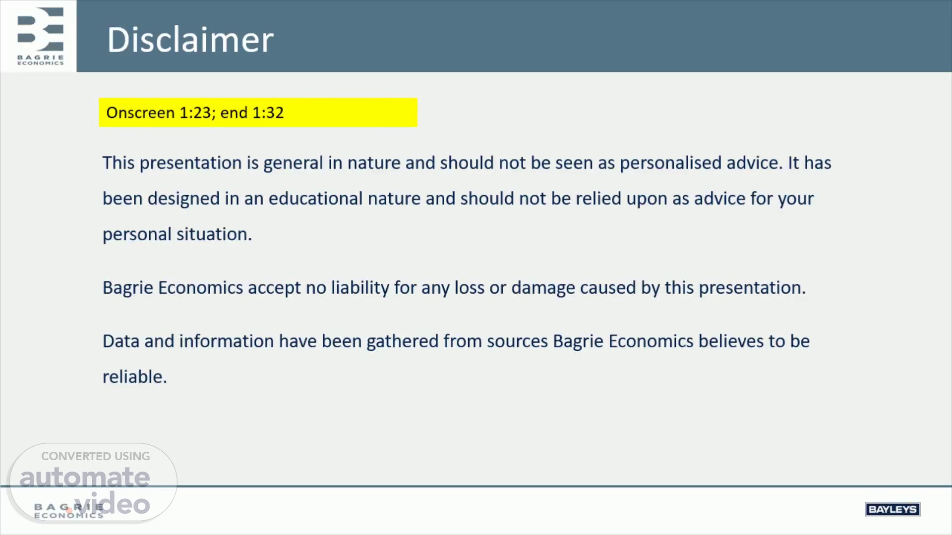 Disclaimer. This presentation is general in nature and should not be seen as personalised advice. It has been designed in an educational nature and should not be relied upon as advice for your personal situation. Bagrie Economics accept no liability for any loss or damage caused by this presentation. Data and information have been gathered from sources Bagrie Economics believes to be reliable..