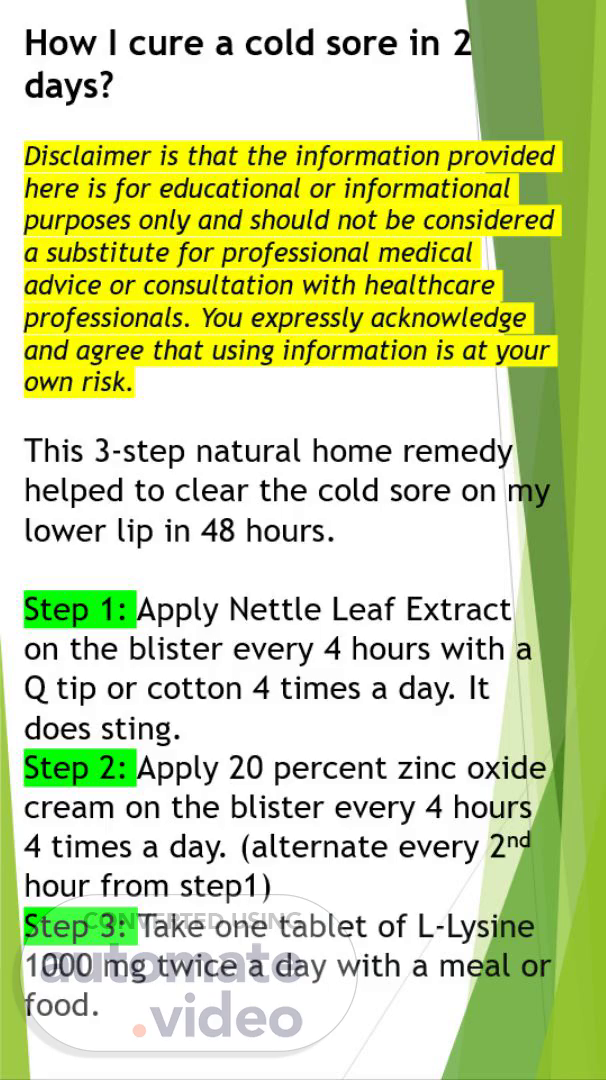 [Audio] % How I cure a cold sore in 2 days? Disclaimer is that the information provided here is for educational or informational purposes only and should not be considered a substitute for professional medical advice or consultation with healthcare professionals. You expressly acknowledge and agree that using information is at your own risk. This 3-step natural home remedy helped to clear the cold sore on my lower lip in 48 hours. Step 1: Apply Nettle Leaf Extract on the blister every 4 hours with a Q tip or cotton 4 times a day. It does sting. Step 2: Apply 20 percent zinc oxide cream on the blister every 4 hours 4 times a day. (alternate every 2nd hour from step1) Step 3: Take one tablet of L-Lysine 1000 mg twice a day with a meal or food..