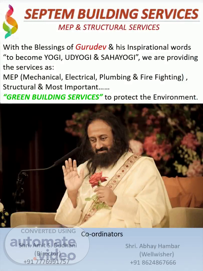 With the Blessings of Gurudev & his Inspirational words “to become YOGI, UDYOGI & SAHAYOGI”, we are providing the services as: MEP (Mechanical, Electrical, Plumbing & Fire Fighting) , Structural & Most Important…… “GREEN BUILDING SERVICES” to protect the Environment..