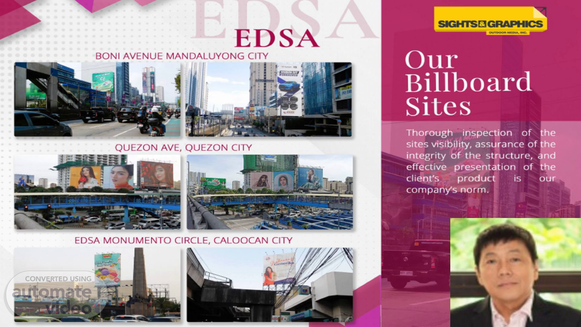 1. [image] EDSA BONI AVENUE MANDALUYONG CITY QUEZON AVE, QUEZON CITY EDSA MONUMENTO CIRCLE, CALOOCAN CITY SIGHTSOGRAPHCS Our Billboard Sites Thorough inspec on of he sites visibility, assurance of he •ntegrity Of the structure, nd effective presentation of he . produ is - our companysznorm..