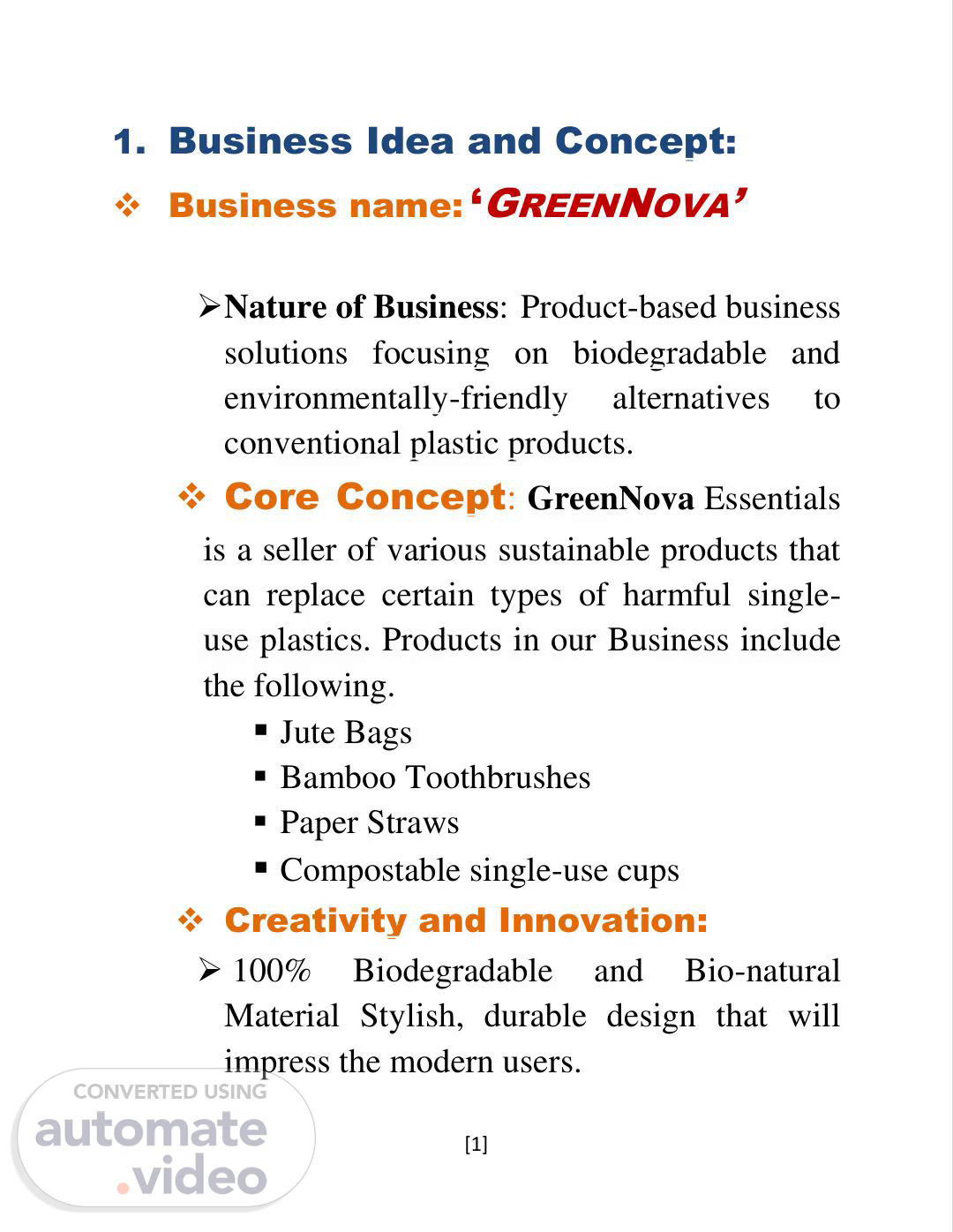 [1] 1. Business Idea and Concept: Business name: ‘GREENNOVA’ Nature of Business: Product-based business solutions focusing on biodegradable and environmentally-friendly alternatives to conventional plastic products. Core Concept: GreenNova Essentials is a seller of various sustainable products that can replace certain types of harmful single- use plastics. Products in our Business include the following. Jute Bags Bamboo Toothbrushes Paper Straws Compostable single-use cups Creativity and Innovation: 100% Biodegradable and Bio-natural Material Stylish, durable design that will impress the modern users..