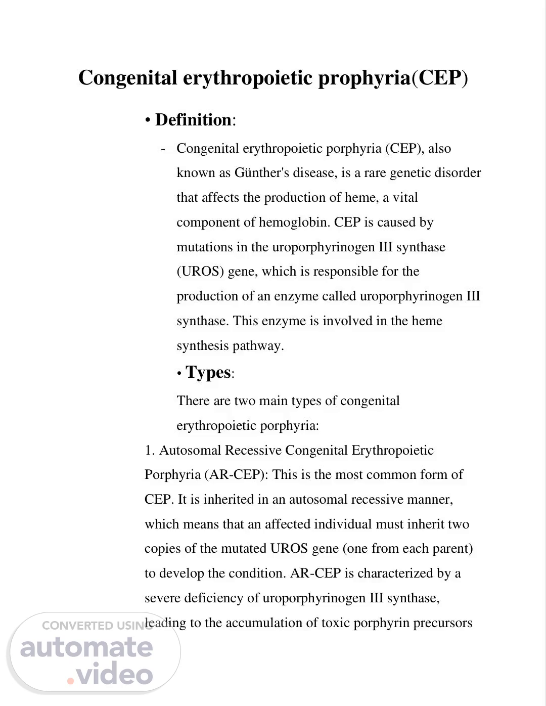 [Audio] Congenital erythropoietic prophyria(CEP) Definition: - Congenital erythropoietic porphyria (CEP), also known as Günther's disease, is a rare genetic disorder that affects the production of heme, a vital component of hemoglobin. CEP is caused by mutations in the uroporphyrinogen III synthase (UROS) gene, which is responsible for the production of an enzyme called uroporphyrinogen III synthase. This enzyme is involved in the heme synthesis pathway. Types: There are two main types of congenital erythropoietic porphyria: 1. Autosomal Recessive Congenital Erythropoietic Porphyria (AR-CEP): This is the most common form of CEP. It is inherited in an autosomal recessive manner, which means that an affected individual must inherit two copies of the mutated UROS gene (one from each parent) to develop the condition. AR-CEP is characterized by a severe deficiency of uroporphyrinogen III synthase, leading to the accumulation of toxic porphyrin precursors.