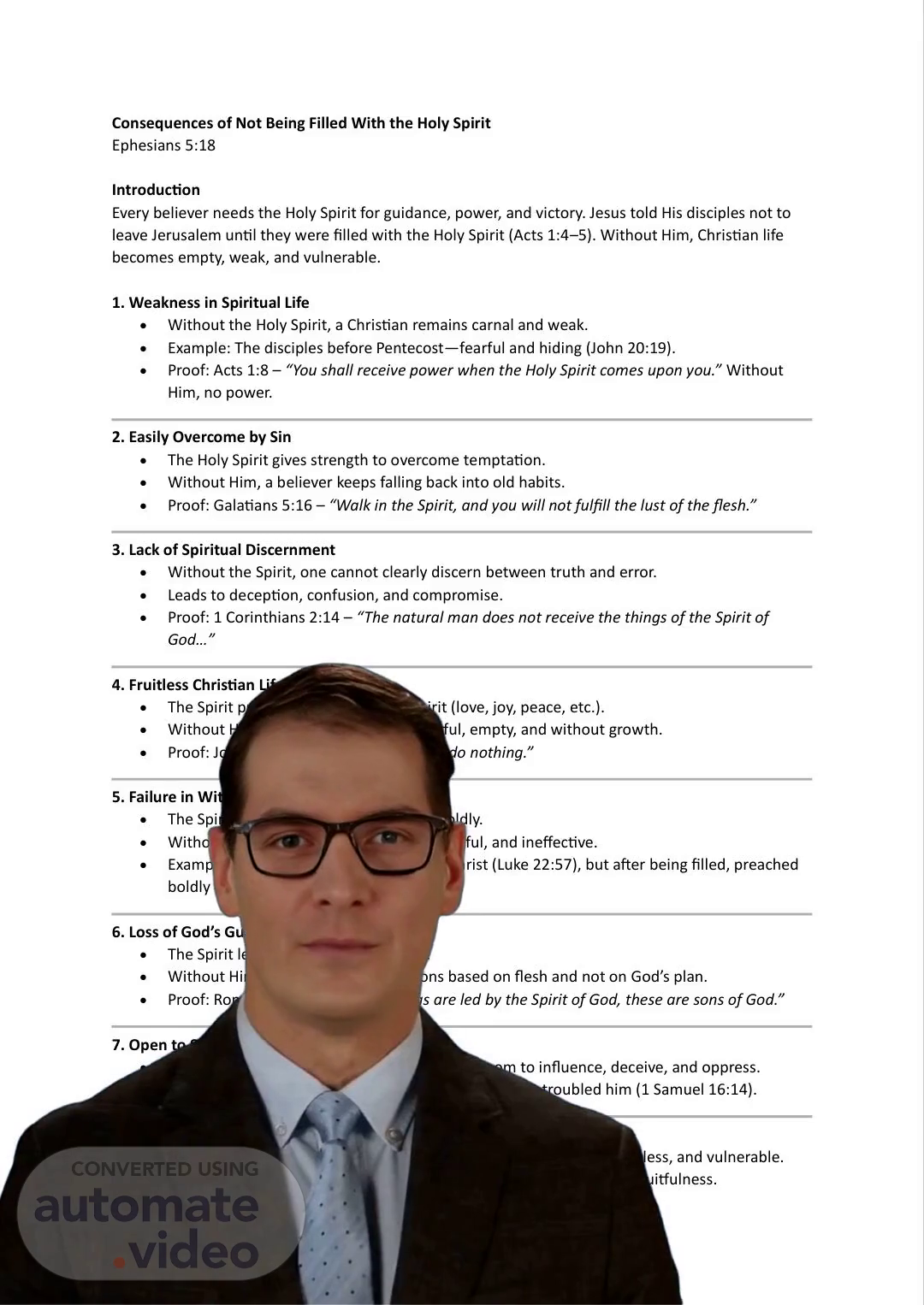 [Virtual Presenter] We believe that every believer needs the Holy Spirit for guidance, power, and victory. Jesus told His disciples not to leave Jerusalem until they were filled with the Holy Spirit, emphasizing the importance of being filled with the Holy Spirit. Without Him, Christian life becomes empty, weak, and vulnerable. We must understand the consequences of not being filled with the Holy Spirit, which include weakness in spiritual life, easily being overcome by sin, lack of spiritual discernment, fruitless Christian life, failure in witnessing and ministry, loss of God's guidance, and being open to Satan's influence. These consequences are evident in the lives of individuals who have not experienced the filling of the Holy Spirit. On the other hand, a Spirit-filled believer walks in victory, power, and fruitfulness. We must be aware of these consequences and strive to be filled with the Holy Spirit, just as Jesus instructed His disciples. By being filled with the Holy Spirit, we can overcome the challenges of a life without Him and live a victorious and fruitful life in Christ. We can walk in the Spirit, overcome temptation, and discern between truth and error. We can produce the fruit of the Spirit and lead others to Christ boldly. We can make decisions based on God's plan and avoid Satan's influence. We must be Spirit-filled believers, just as Jesus desires for us to be. We can be filled with the Holy Spirit by following the example of Jesus and His disciples, who waited in Jerusalem for the Holy Spirit to come upon them. We can pray for the Holy Spirit to fill us, just as Jesus instructed His disciples to do. We can seek to be filled with the Holy Spirit daily, asking Him to control our lives and guide us in His will. We can be Spirit-filled believers, living a life of victory, power, and fruitfulness. We can be the witnesses of Christ that He desires for us to be, sharing His love and message with the world. We can be the light of the world, shining brightly for Him. We can be the salt of the earth, preserving and purifying those around us. We can be the temples of the Holy Spirit, filled with His power and presence. We can be the vessels of God's love, pouring out His love to those around us. We can be the messengers of God's message, sharing His word with those who need to hear it. We can be the servants of God, serving Him with all our hearts, minds, and souls. We can be the children of God, beloved and cherished by Him. We can be the friends of God, walking with Him in His ways and enjoying His presence. We can be the followers of Jesus, imitating His example and living according to His teachings. We can be the disciples of Jesus, learning from Him and growing in our relationship with Him. We can be the missionaries of Jesus, spreading His message and making disciples of all nations. We can be the ambassadors of Jesus, representing Him and His kingdom to the world. We can be the representatives of Jesus, speaking for Him and His will. We can be the messengers of Jesus, sharing His love and message with the world. We can be the vessels of Jesus, carrying His presence and power to those around us. We can be the temples of Jesus, filled with His Holy Spirit and living according to His will. We can be the children of God, beloved and cherished by Him. We can be the friends of God, walking with Him in His ways and enjoying His presence. We can be the followers of Jesus, imitating His example and living according to His teachings. We can be the disciples of Jesus, learning from Him and growing in our relationship with Him. We can be the missionaries of Jesus, spreading His message and making disciples of all nations. We can be the ambassadors of Jesus, representing Him and His kingdom to the world. We can be the representatives of Jesus, speaking for Him and His will. We can be the messengers of Jesus, sharing His love and message with the world. We can be the vessels of Jesus, carrying His presence and power to those around us. We can be the temples of Jesus, filled with His Holy Spirit and.