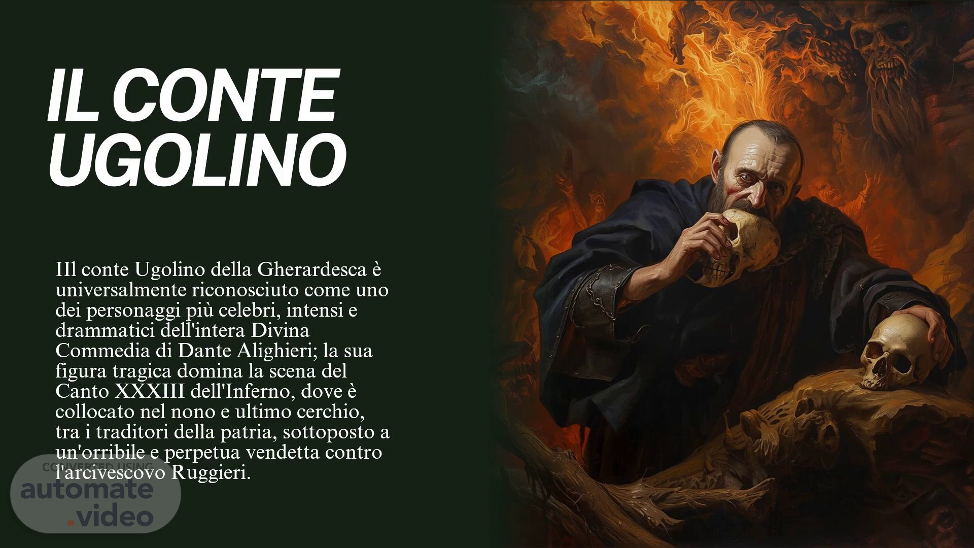 IL CONTE UGOLINO. IIl conte Ugolino della Gherardesca è universalmente riconosciuto come uno dei personaggi più celebri, intensi e drammatici dell'intera Divina Commedia di Dante Alighieri; la sua figura tragica domina la scena del Canto XXXIII dell'Inferno, dove è collocato nel nono e ultimo cerchio, tra i traditori della patria, sottoposto a un'orribile e perpetua vendetta contro l'arcivescovo Ruggieri..