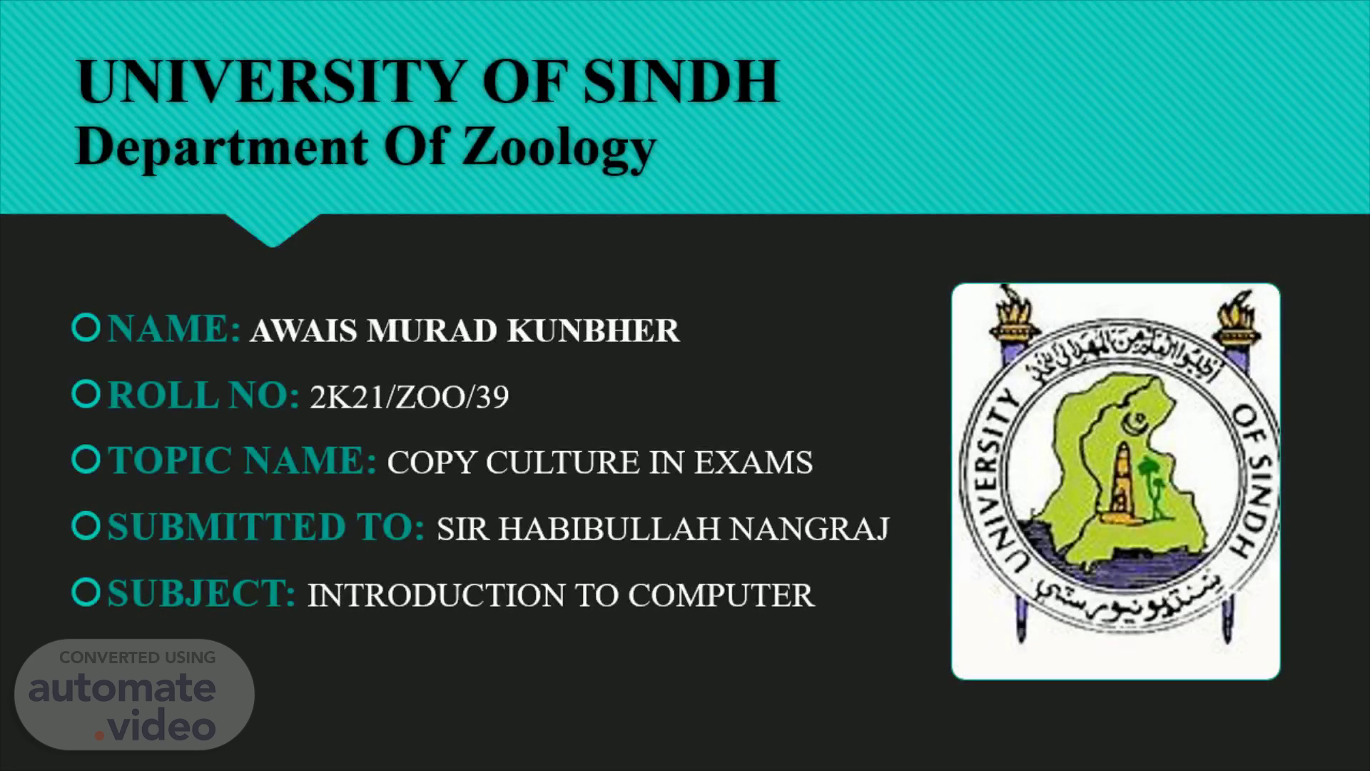 UNIVERSITY OF SINDH Department Of Zoology. NAME: AWAIS MURAD KUNBHER ROLL NO: 2K21/ZOO/39 TOPIC NAME: COPY CULTURE IN EXAMS SUBMITTED TO: SIR HABIBULLAH NANGRAJ SUBJECT: INTRODUCTION TO COMPUTER.
