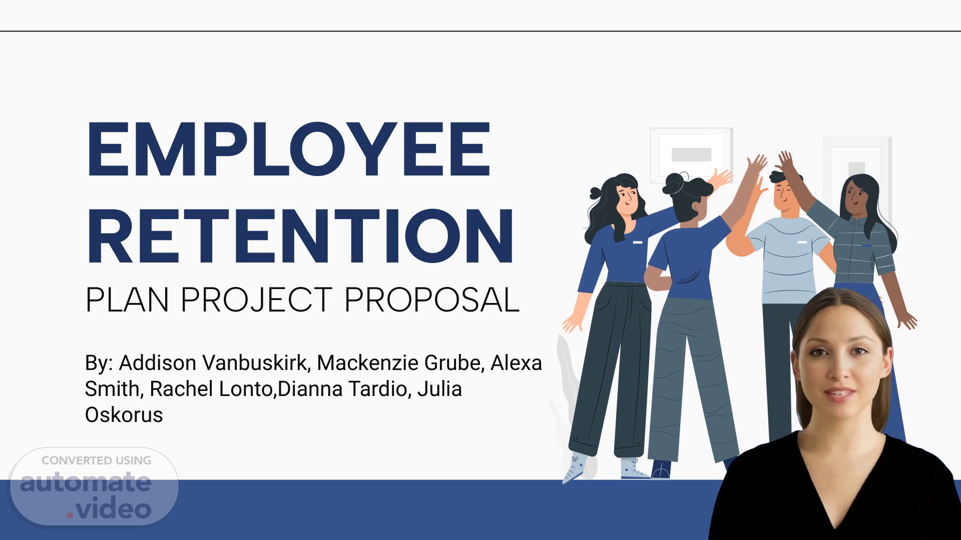[Audio] We are here to present to you the Employee Retention Plan Proposal. This proposal was created by Addison Vanbuskirk, Mackenzie Grube, Alexa Smith, Rachel Lonto, Dianna Tardio, and Julia Oskorus. The purpose of this proposal is to address the issue of employee turnover in organizations and to provide strategies to retain employees. Employee retention is essential for the success of any organization. It is a key factor that influences the performance of a company. Losing employees can have a significant impact on the organization, including decreased productivity, increased costs, and lost knowledge and expertise. To understand why employee retention is essential, we need to consider what employees do. Employees are the backbone of any organization. They are responsible for carrying out the goals and objectives of the company. They are the ones who interact with customers, suppliers, and partners. They are the ones who create and innovate. Therefore, it is in the best interest of any organization to retain its employees. By doing so, the organization can maintain its productivity, reduce its costs, and improve its performance. In this proposal, we will discuss the key factors that influence employee retention and the strategies that organizations can use to retain their employees. We will also explore the impact of turnover on a company's performance and the benefits of a well-designed employee retention plan. We hope that this proposal will provide you with valuable insights and strategies to improve employee retention in your organization..